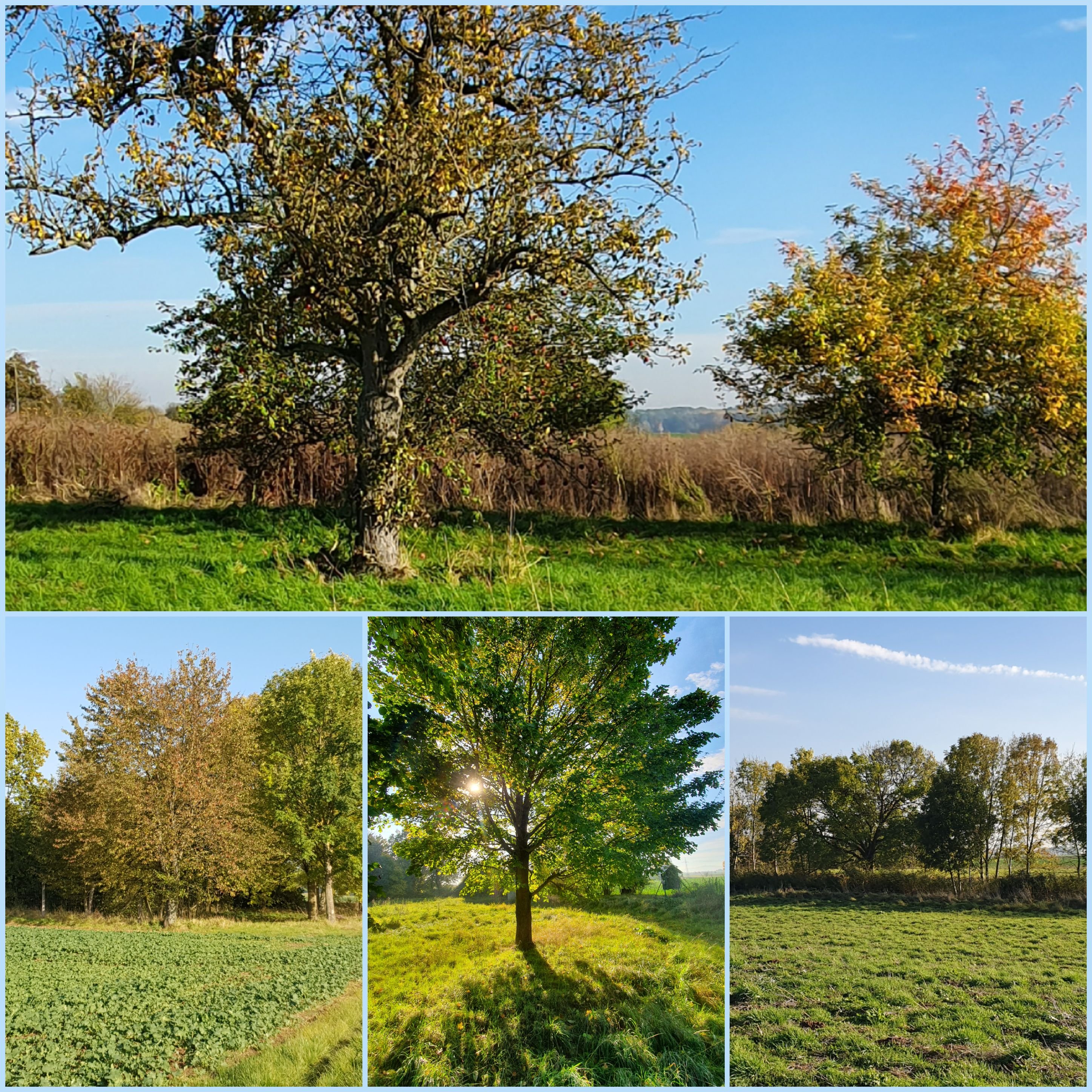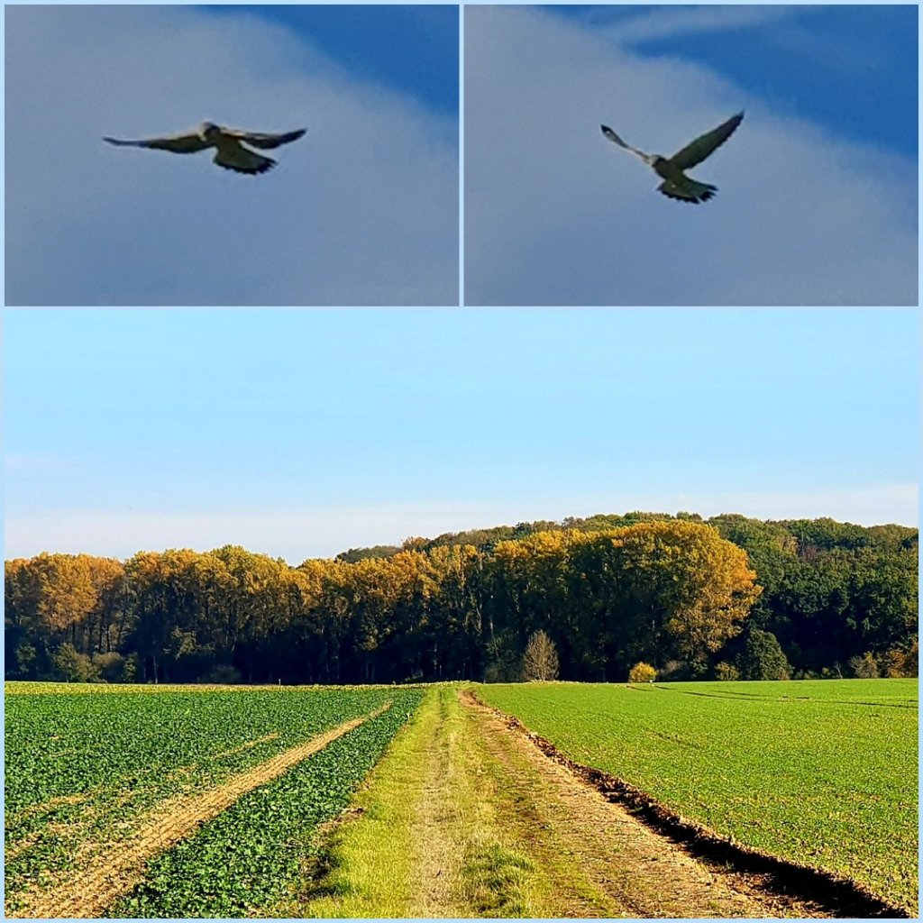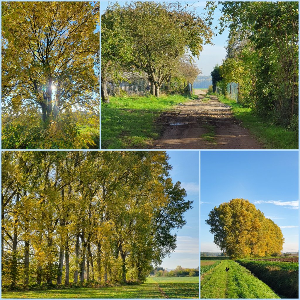 Dieses strahlende Licht! Die beiden unteren Fotos zeigen meine Lieblingspappeln. Wenn ich meine Mutter besuche, wartet Rusty nur auf das Kommando „Auf, wir gehen Gassi!“ Er liebt es, nach Stöckchen zu rennen und sich im Gras zu welzen. Ich verrate nicht, dass meine Wurfkünste recht bescheiden sind.😊Diese Farben! Noch tragen die Bäume ihr buntes Kleid. Gugg Richtung Süden Der Alte Berg und oben in der Luft verharrt ein Falke (schätze ich).