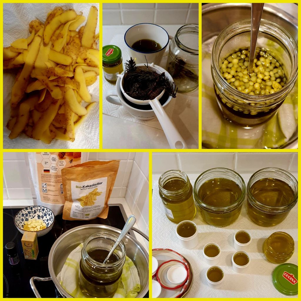 Die Kräuter und die Kartoffelschalen plus Olivenöl ließ ich für einige Stunden im Wasserbad bei ca. 70°C ausziehen. Nach dem Abfiltern hatte ich ca. 450 ml Ölauszug. Diesen erwärmte ich und schmelzte darin Bienenwachs und Kakaobutter. Vom ätherischen Öl habe ich ca. 50 Tropfen in die Mischung laufen lassen. Danach füllte ich die noch flüssige Salbe in Tiegel und verschraubte sie nach dem Abkühlen.