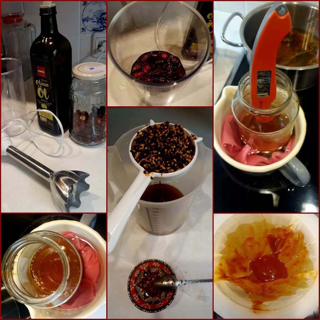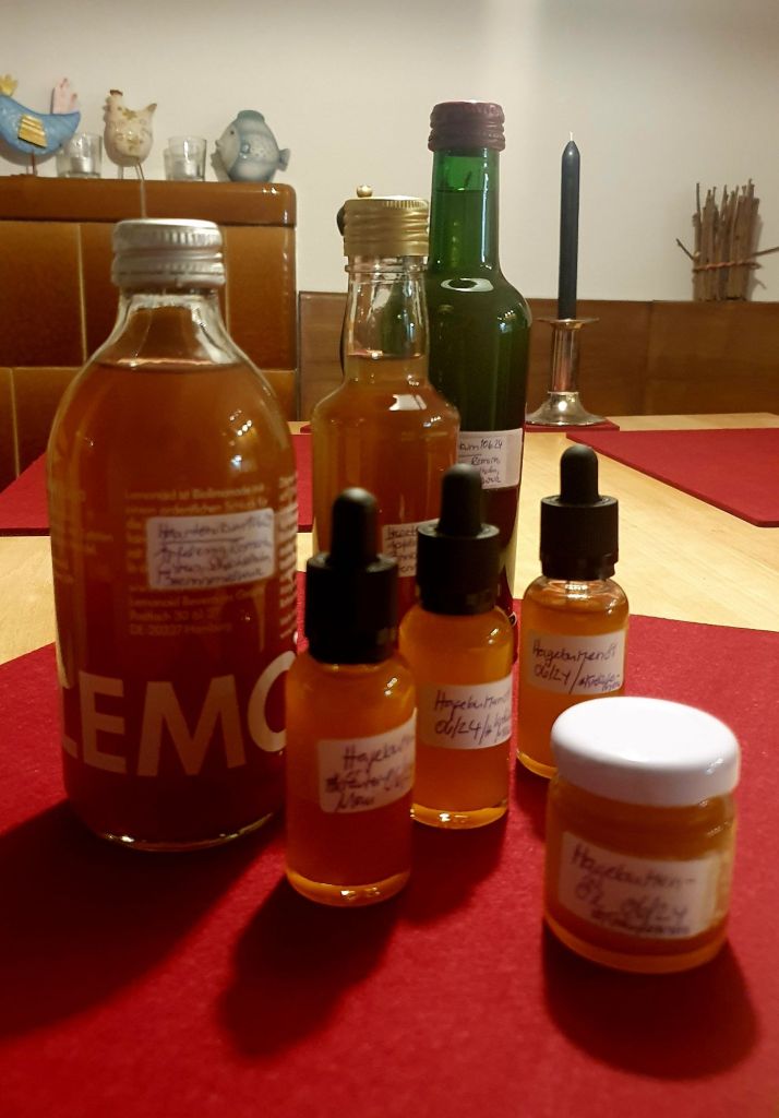 Alle Pflanzen werden zu  gleichen Teilen mit Olivenöl püriert und im Wasserbad für mindestens 2 Stunden bei 40° bis 70°C ausgezogen. Danach wird das Gemisch gefiltert. Das Hagebuttenöl verwende ich pur und die beiden anderen Ölauszüge werden zu Salben verarbeitet.