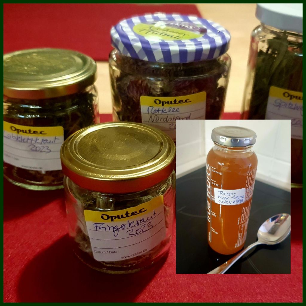 Die getrockneten Pflanzen werden in Gläser gefüllt und beschriftet. Das Oxymel aus Tannenwipfeln, Essig und Honig zog 6 Wochen im Kühlschrank aus und wurde danach abgesiebt. Ich nehme es täglich esslöffelweise zur Immunstimmulierung ein.