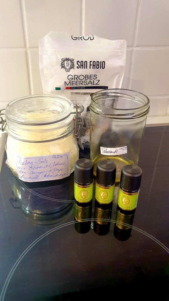 Zusätzlich kann man noch Kaffeepulver mit ins Öl geben, ich habe mich diesmal dagegen entschieden. Kaffee wirkt u.a. Haut stimulierend.