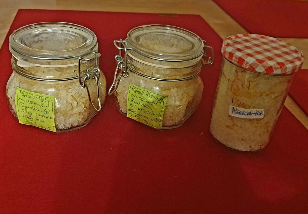 Ein Salzpeeling wirkt mechanisch auf die Haut  und entfernt Hautschuppen und Verschmutzungen, es kurbelt die Durchblutung an und macht die Haut rosig. Die Mineralien dringen tief in die Haut ein und liefern ihr Nähr- und Aufbaustoffe. Besonders bei Neurodermitis kann es positiv unterstützen. Das Öl pflegt und liefert ebenso Nährstoffe. Weidenrinde im Öl lindert Schmerzen, gut, z.B. wenn man „Rücken“ hat. Die ätherischen Öle regen alleine durch ihren Duft an und haben unterstützende Wirkungen. Bei empfindlicher Haut vorsichtig herausfinden, wie viel Peeling gut tut.