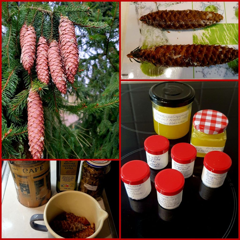 Beim Laufen entdeckte ich eine Fichte mit vor Harz triefenden Zapfen. Zwei davon erntete ich vorsichtig, zerkleinerte sie und ließ sie einige Stunden in heißem Olivenöl aus. Normalerweise erntet man das Harz von Bäumen, indem man es vorsichtig von der Rinde abschabt. Bäume produzieren Harz um Wunden zu verschließen. Das Harz schützt vor Pilzen, Bakterien und Viren. Es legt sich wie eine zweite Haut über die Wunde und schützt sie dadurch. Beim Sammeln muss man darauf achten, dass man keine alten Wunden aufreißt.