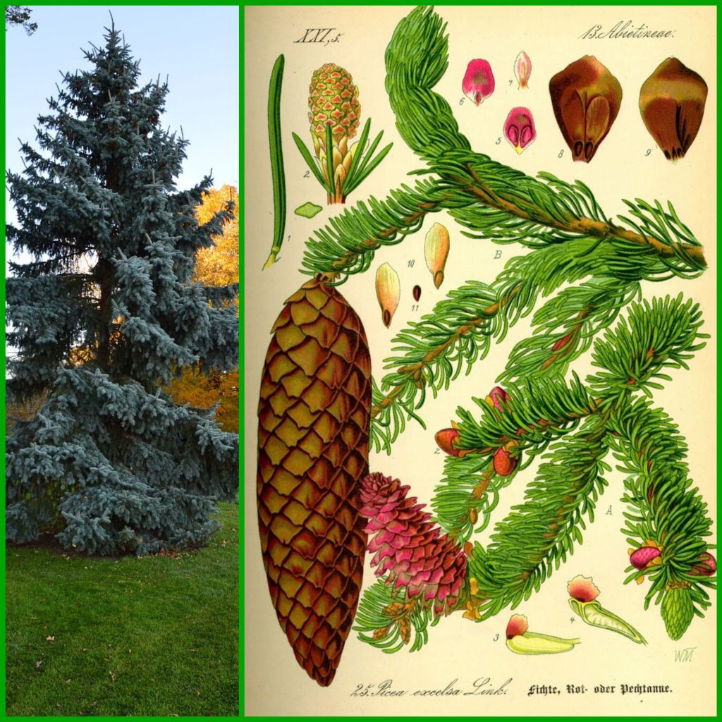 Links ein Bild der Blaufichte, die früher oft als Weihnachtsbaum verwendet wurde. Heute nimmt man eher Tannen, denn diese haben weichere Nadeln und rieseln weniger. „Die Fichte sticht – die Tanne nicht.“ Ein weiteres Merkmal der Fichte ist, dass die Zapfen hängen. Bei Tannen stehen die Zapfen wie Kerzen am Baum und zerbröseln, wenn sie abfallen. Fichten und Tannen sind eng miteinander verwandt und haben ähnliche heilwirksame Inhaltsstoffe.