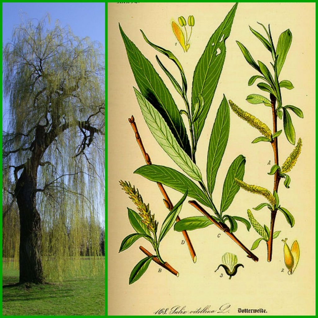 Weide (Salix) – es gibt verschiedene Weidenarten, die ähnlich in ihren Heilwirkungen sind. Das linke Foto zeigt eine Trauerweide.