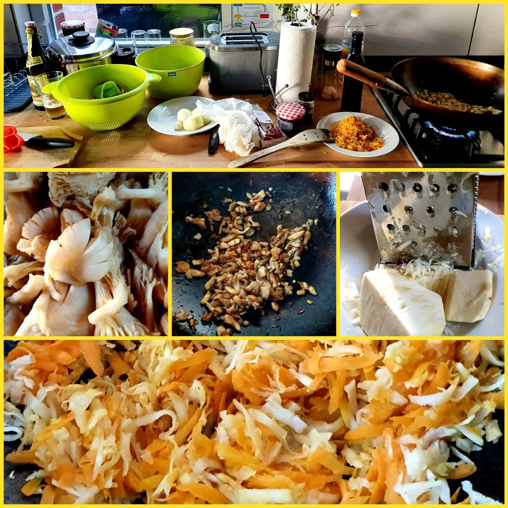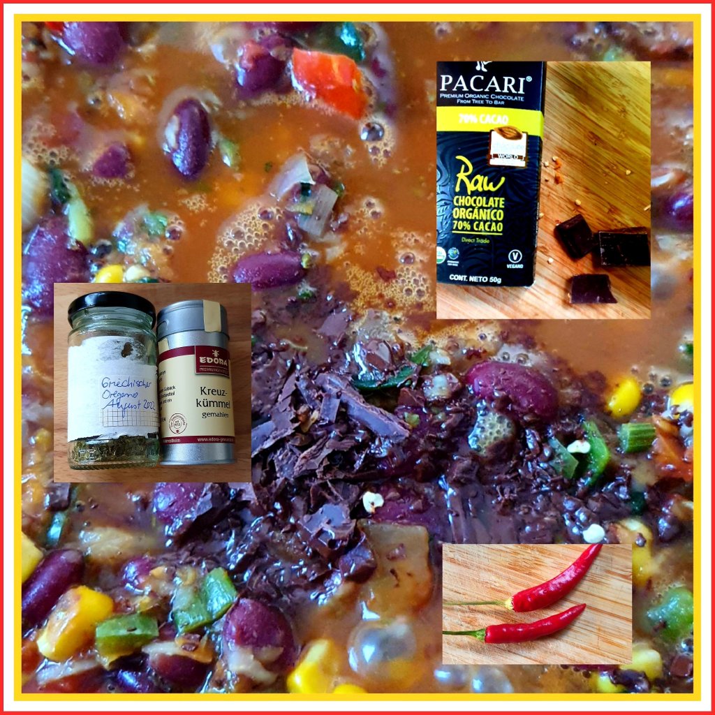 Als Fleischersatz schlägt Sebastian kleingeschnittene/geraspelte Austernpilze vor, weil die eine fleischige Textur haben. Diese werden in Olivenöl so lange gebraten, bis sie eine schöne Röstung haben. Danach kommen geraspelte Karotten und Sellerie hinzu – dies wird gebraten, bis alles leicht braun ist. Um einen noch markanteren Geschmack zu bekommen, kann man einige getrocknete kleingeschnittene Shitakepilze hinzufügen. Ich habe aber keine gefunden beim Supermarkt meines Vertrauens.Nach und nach kommen grob geschnittene Zwiebeln, Paprika, die restlichen Karotten, Selleriegrün, Lauch, Knoblauch, Mais, Kidneybohnen (inclusive Kochwasser!) und stückige Tomaten hinzu.Würze bringen: Salz, Oregano, Kreuzkümmel, frischer Koriander (wer’s mag), verschiedene Chilisorten, Tomatenmark + Saft einer halben Orange und eine kleine Tasse Espresso. Zum Abrunden des Geschmacks werden 3 bis 4 Stücke geraspelte Bitterschokolade untergehoben. Ich hätte nicht gedacht, daß Schokolade dem Ganzen den entscheidenden „Pfiff“ gibt.