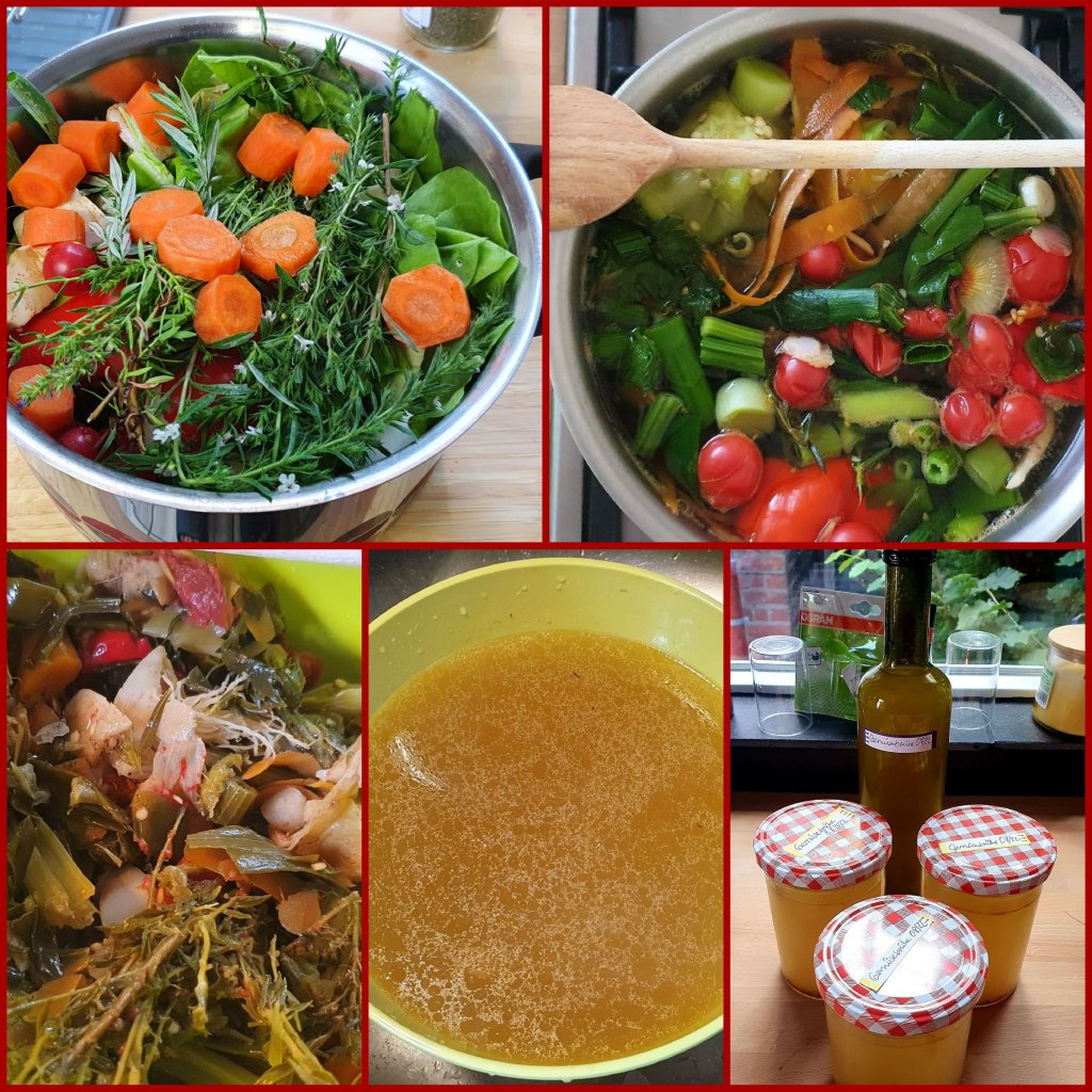 Gemüseabfälle aus: Mangoldblättern, Isop, Bohnenkraut, Schalen, Grünes und Strünke von Karotten und Sellerie, Lauchzwiebeln, Porree, weichen Tomaten, Knoblauch, Zwiebeln, Paprikaresten … ergeben einen aromatischen Sud. Damit habe ich z.B. Bulgur gekocht. Nach dem Kochen wandert das ausgekochte Gemüse in den Kompost.