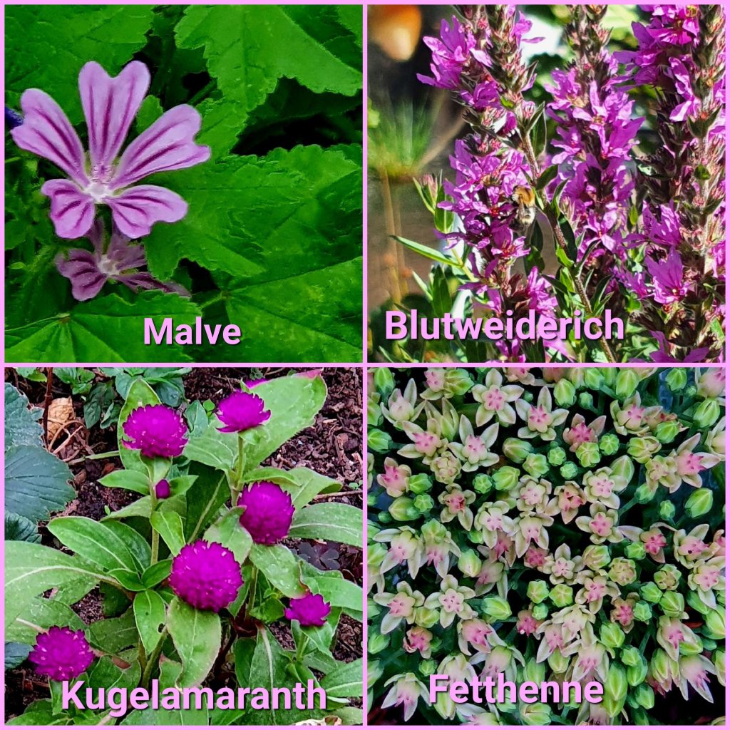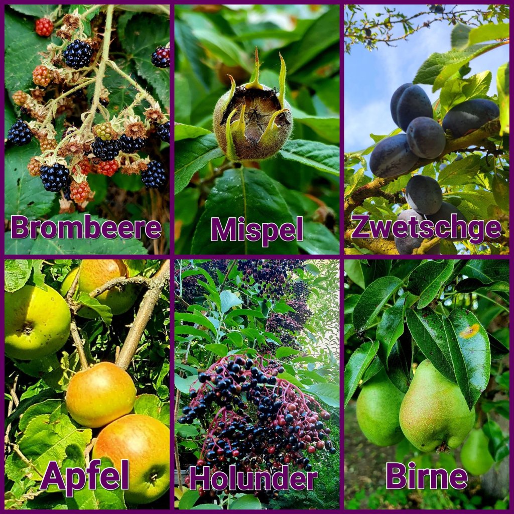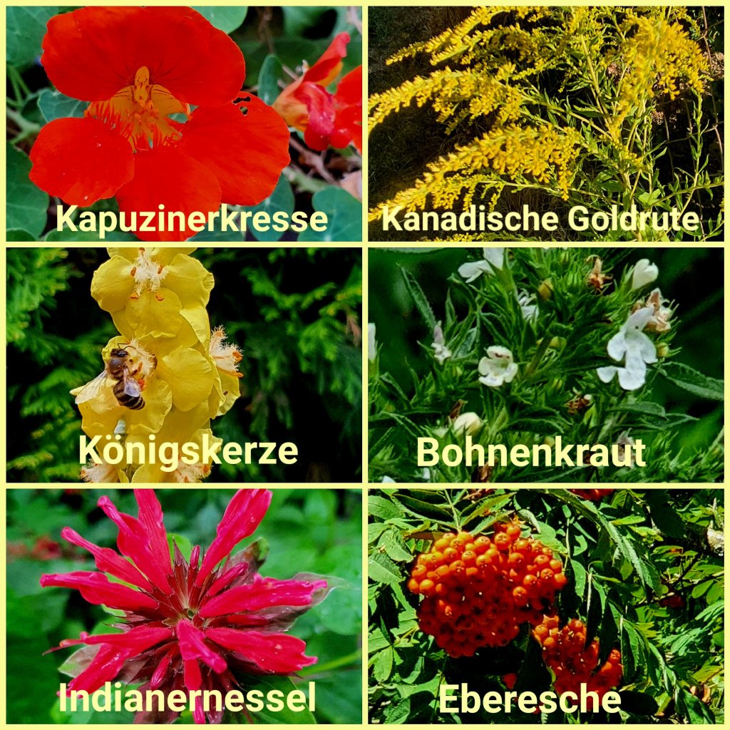 Lila oder pinky? Egal, hauptsache es blüht!Die Fette Henne (Hylotelephium telephium) ist ein Dickblattgewächs und hat ähnliche Heilwirkung wie die Aloe Vera. Ihr Gel kann bei Hautleiden und -Entzündungen und bei der Heilung von Brüchen helfen.Das sind dieses Jahr schon frühreife Früchtchen! Die Mispel (Mespilus germanica) ist ein Strauch, der hierzulande eine Renaissance erlebt. Die Frucht eignet sich zur Herstellung von Marmeladen, Kompotten, Weinen und Obstbränden. Frost oder Überreife machen das Fruchtfleisch teigig und genießbar, weil die herbe Fruchtsäure so abgebaut werden kann.Die gemeine Haselnuss (Corylus avellana) – unser Busch hat uns das erste Mal reich beschenkt. Jetzt überlege ich noch, was ich damit Schönes machen kann. Haselnüsse enthalten eine hohe Konzentration an Vitamin E, B-Vitaminen und wertvollen Ölen. Vitamin E wirkt antioxidativ, d.h. zellschützend, entzündungshemmend und Immunsystem stärkend. Die B-Vitamine wirken besonders günstig auf unser Nervensystem. Um die Haselnuss ranken sich einige Legenden, so soll sie Blitze ableiten und vor Schlangen schützen. Ihre Zweige werden als Wünschelruten verwendet, die Wasser, Metalle und sogar Verbrecher aufspüren sollen.Kapuzinerkresse – Blüten und Blätter haben ein angenehme Schärfe, sie schmecken würzig als Beigabe in Salaten, Suppen und Kräuterbutter. Deren Senfölglykoside wirken antibakteriell. Die kanadische Goldrute ist ein Neophyt, der wesentlich häufiger als unsere heimische Goldrute vorkommt. Die Wirkung beider Goldrutenarten ist wundheilend und hilft u.a. bei Nieren- und Blasenproblemen. Die Königskerze hat wertvolle Schleimstoffe, die den Rachenraum schützen und bei Erkältungen helfen. Das Bohnenkraut ist mit dem Thymian verwandt und kann ähnlich eingesetzt werden, z.B. bei Husten und Problemen im Magen- und Darmtrakt. Die Indianernessel hilft bei Kopfschmerzen, Übelkeit, Erkältung, Fieber oder Nervosität. Die Eberesche (Vogelbeere) kann bei Verdauungsbeschwerden, Husten, Problemen im Magen-Darm-Trakt, bei Rheuma, Gicht und Hämorrhoiden helfen. Die Schwedische Mehlbeere (Sorbus intermedia) ist ein artgewordener Hybrid (ohne Zutun des Menschen) durch eine Kreuzung zwischen der Eberesche (Sorbus aucuparia), der Mehlbeere (Sorbus aria) und der Elsbeere (Sorbus torminalis). Die Beeren helfen bei Verdauungsproblemen (z.B. Durchfall, Darmträgheit), und bei Atemwegsbeschwerden. (Diesen Baum habe ich in Memmingen/Allgäu entdeckt.)