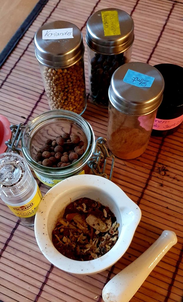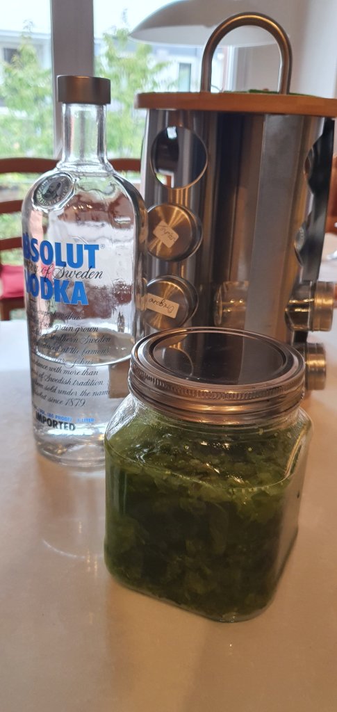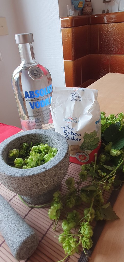 Hopfentropfen: Wodka, Hopfen, ZuckerAlles gemörsert wird’s schön grün – das liegt am Chlorophyll. Das Mazarat muss jetzt ca. 5 Wochen ausziehen. Dabei wird es immer mal leicht geschwenkt, so dass sich die Inhaltsstoffe besser lösen. Piment, Koriandersamen, Vanilleschote, Zitronenabrieb, Zimt und wenig Wacholder werden gemörsert und zum Auszug gegeben. Zudem kommen noch Zitronensaft und Limettenscheiben hinzu.
