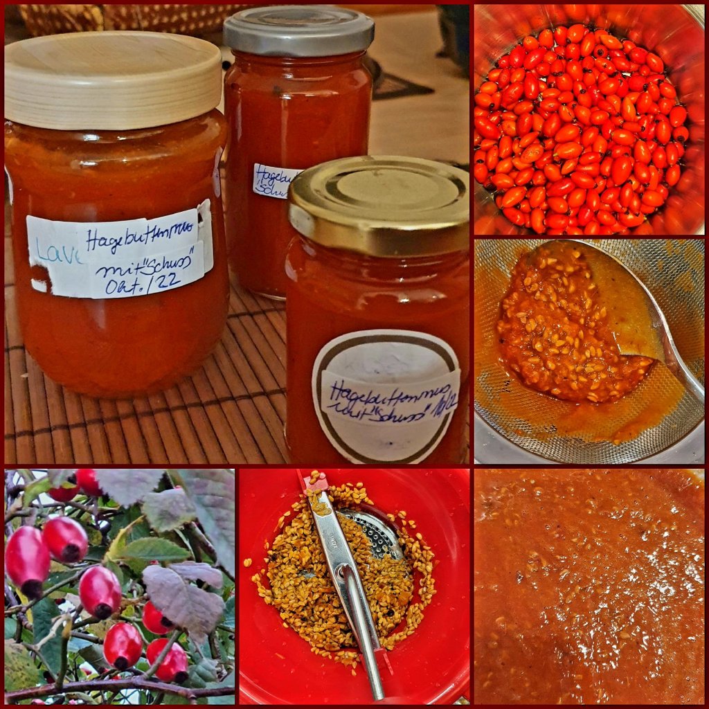 Die gewaschenen Hagebutten werden mit Wasser so lange geköchelt, bis sie weich sind. Danach werden sie gestampft und mit dem Kochwasser passiert. Ich musste das 2x wiederholen, damit alle Kerne draußen waren. Was für eine Arbeit! Die Kerne werden gewaschen und getrocknet für Kernletee. Das Mus wird zu Chutney und Konfitüre verarbeitet. Ich nehme dazu gerne Gelierzucker im Verhältnis 1:3.
