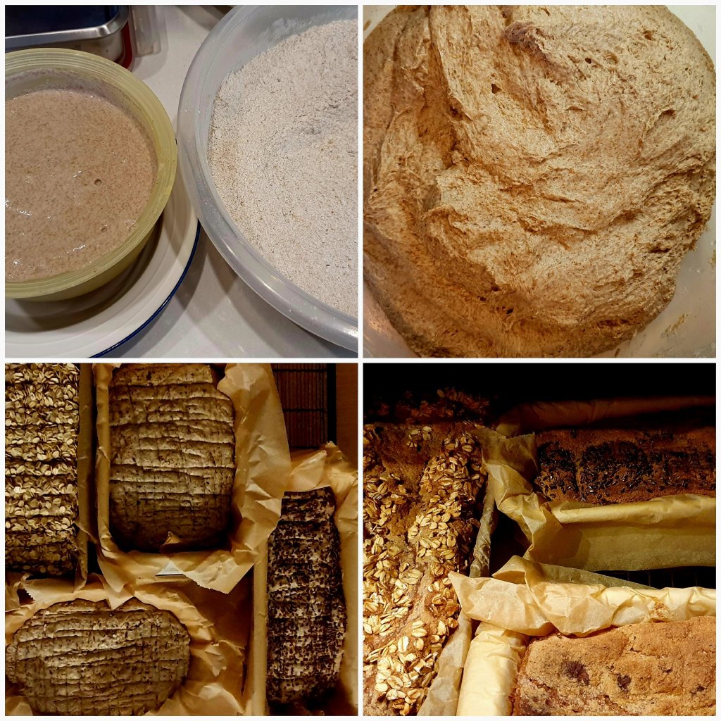 Wenn der Sauerteigansatz blubbert, wird er mit Mehl, Wasser und Salz zu einem Teig verrührt. Dieser wird alle paar Stunden gefaltet und durchläuft eine Wärmephase sowie eine Kaltphase. Dieses Mal buk ich 4 Brote: Mit Koriander &Kümmel, Leinsamen, Salz&Pfeffer und Haferflocken. Ein gutes Brot braucht einen Tag. Gegen 2.30 Uhr stellte ich es zum Abkühlen auf’s Rost.
