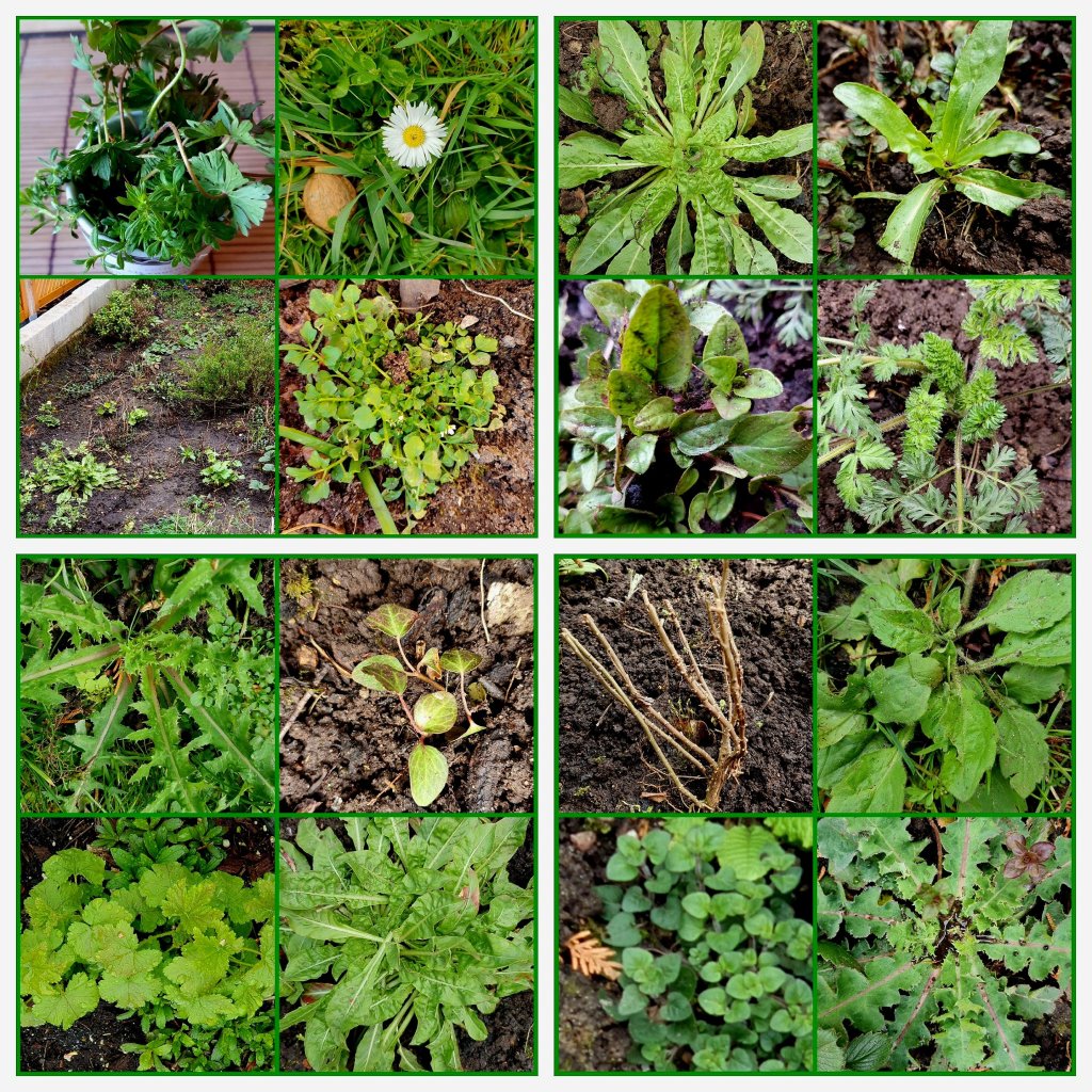 Von rechts nach links: Storchenschnabel und Klettlabkraut zum Wurzelziehen, Gänseblümchen, Nachtkerze, Feldsalat?, ein Stück Kräutergarten, Schaumkraut, Braunelle, wilde Möhre, Gäbsedistel, Efeu, ?, Gänseblümchen, rote Johannisbeere, Nachtkerze, Oregano, Pippau oder Distel.