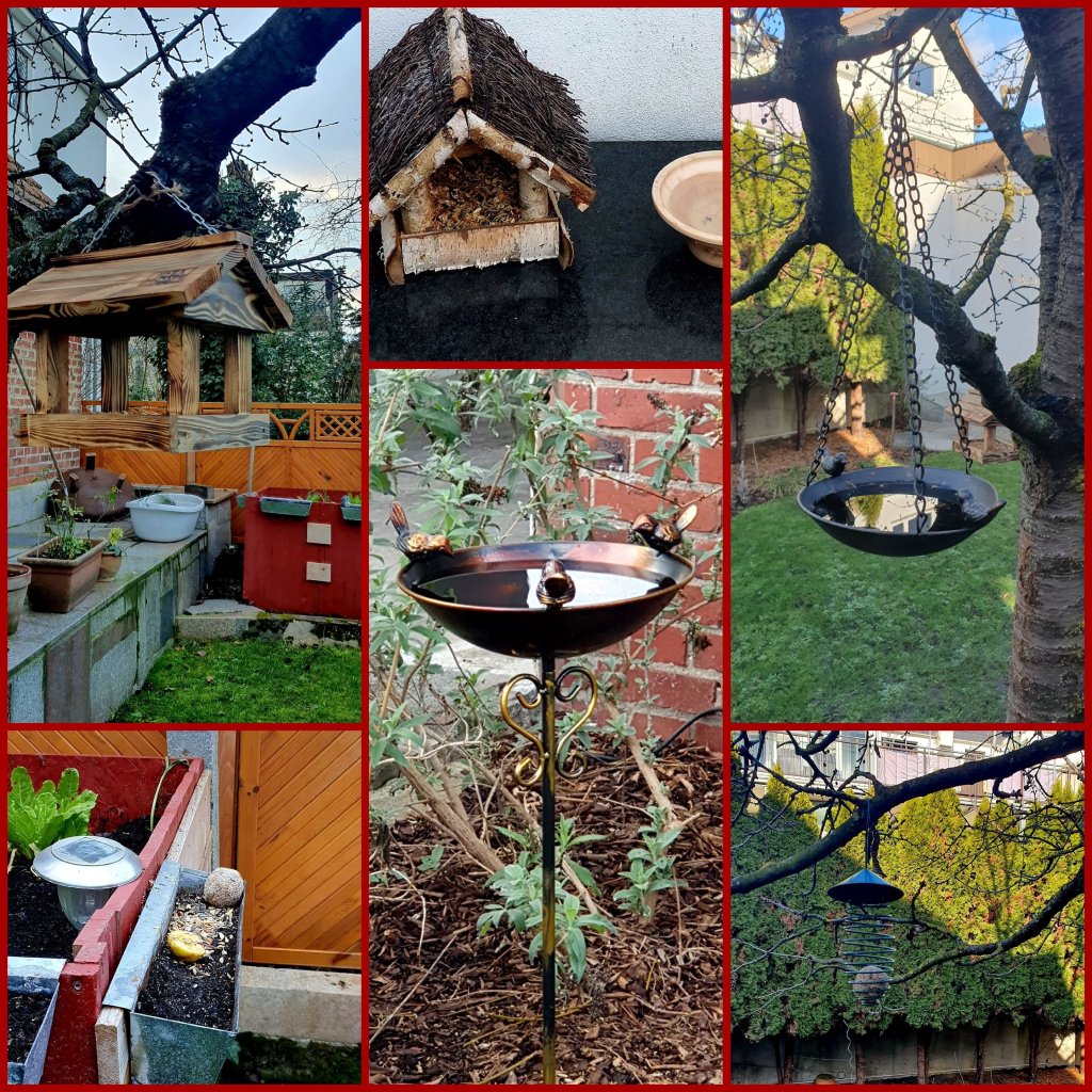In diesem Jahr sind wesentlich weniger Vögel bei uns zu Besuch. Daher habe ich Futter- und Wasserstellen errichtet und Nistkästen aufgehängt. Die Vögel, die das gerne annehmen, sind Tauben, die überall ihren „Dreck“ hinterlassen und freche Elstern, die die kleineren Vögel abschrecken. Die Elstern sind schon irgendwie clever, denn regelmäßig schaukeln sie ein Futterhäuschen so stark, dass Futter auf den Boden fällt. Das wird dann gleich aufgepickt.