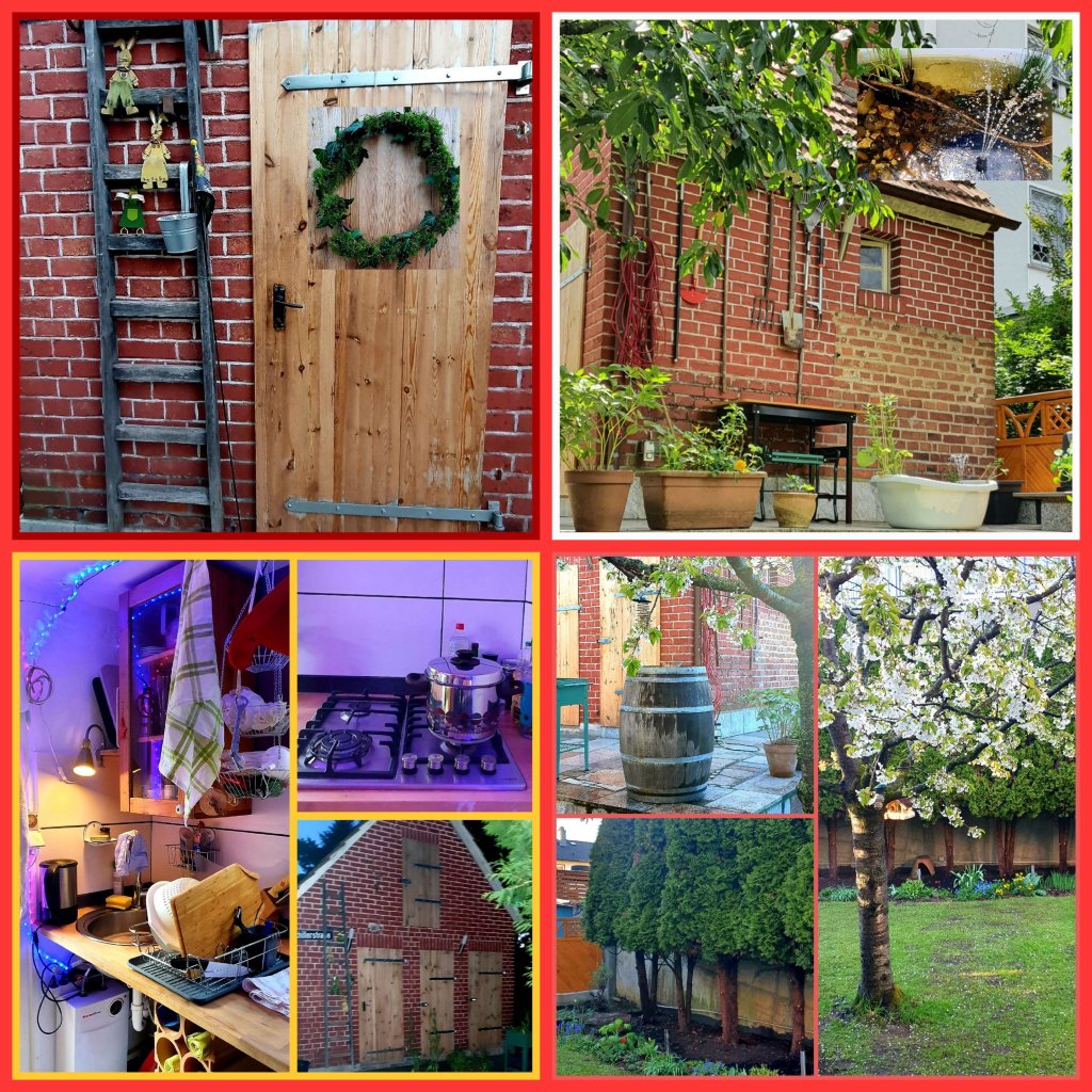 Gartenhaus mit Sommerküche, der Süßkirschbaum und die noch einigermaßen intakte Tujahecke.
