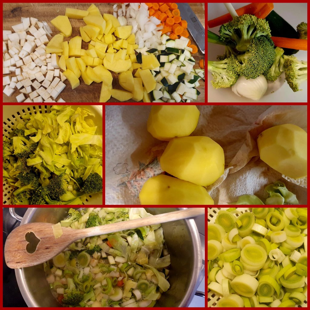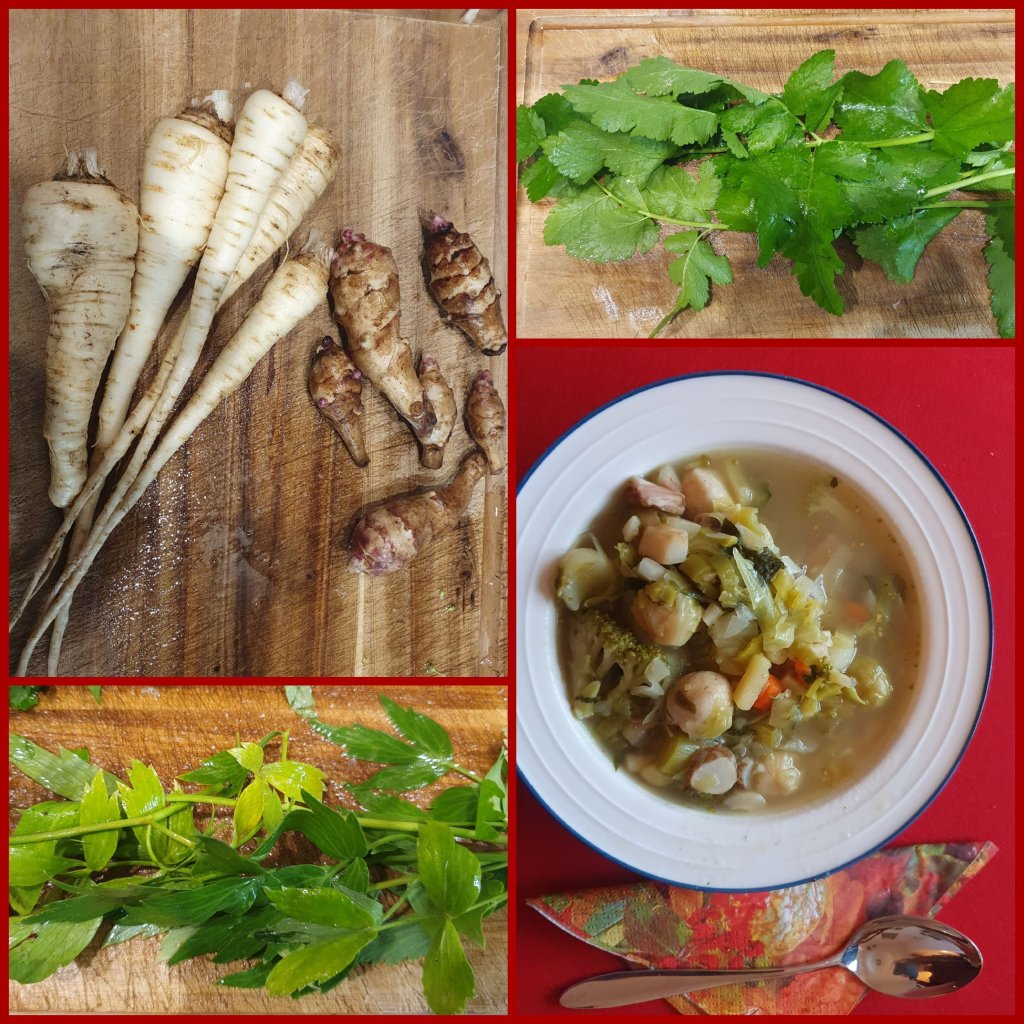 Alles, was der Vorrat hergibt, kommt in die Suppe und im Garten werden die Wurzeln ausgegraben. Wie gut, dass ich ungefähr weiß, wo im Sommer der Topinambur stand und die Pastinaken wachsen eh im Hochbeet. Das Gemüse wird geschält, geputzt, geschnippelt und in Wasser geköchelt bis es gar ist. z.B. Brokkoli, Kartoffeln, Zwiebeln, Spitzkohl, Möhren, Knollensellerie, Pastinaken, Topinambur. Als Würze kann man Suppenpulver und Muskatnuss verwenden, etwas Misopaste einrühren – lecker! Für frisches Grün sorgen Pastinakenkraut, ein paar Stengel Liebstöckel oder Petersilie. Et voilá – fertig ist eine leckere warme Mahlzeit.