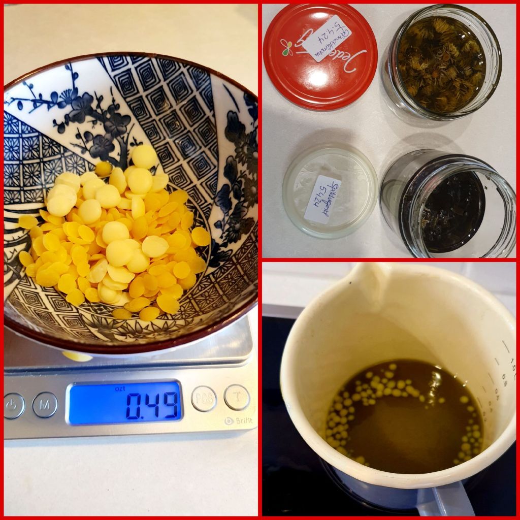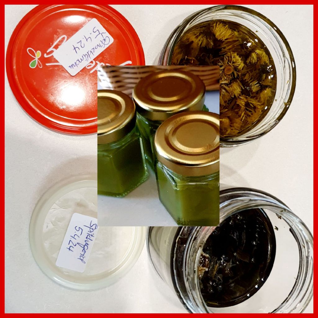 Die Ölauszüge wurden mit Bienenwachs, Kakaobutter und ätherischen Ölen zu Salben verarbeitet. Pro 100 ml verwende ich ca 20 g Bienenwachs und 5 g Kakaobutter für die Cremigkeit. Meine Salbe ist ziemlich fest.