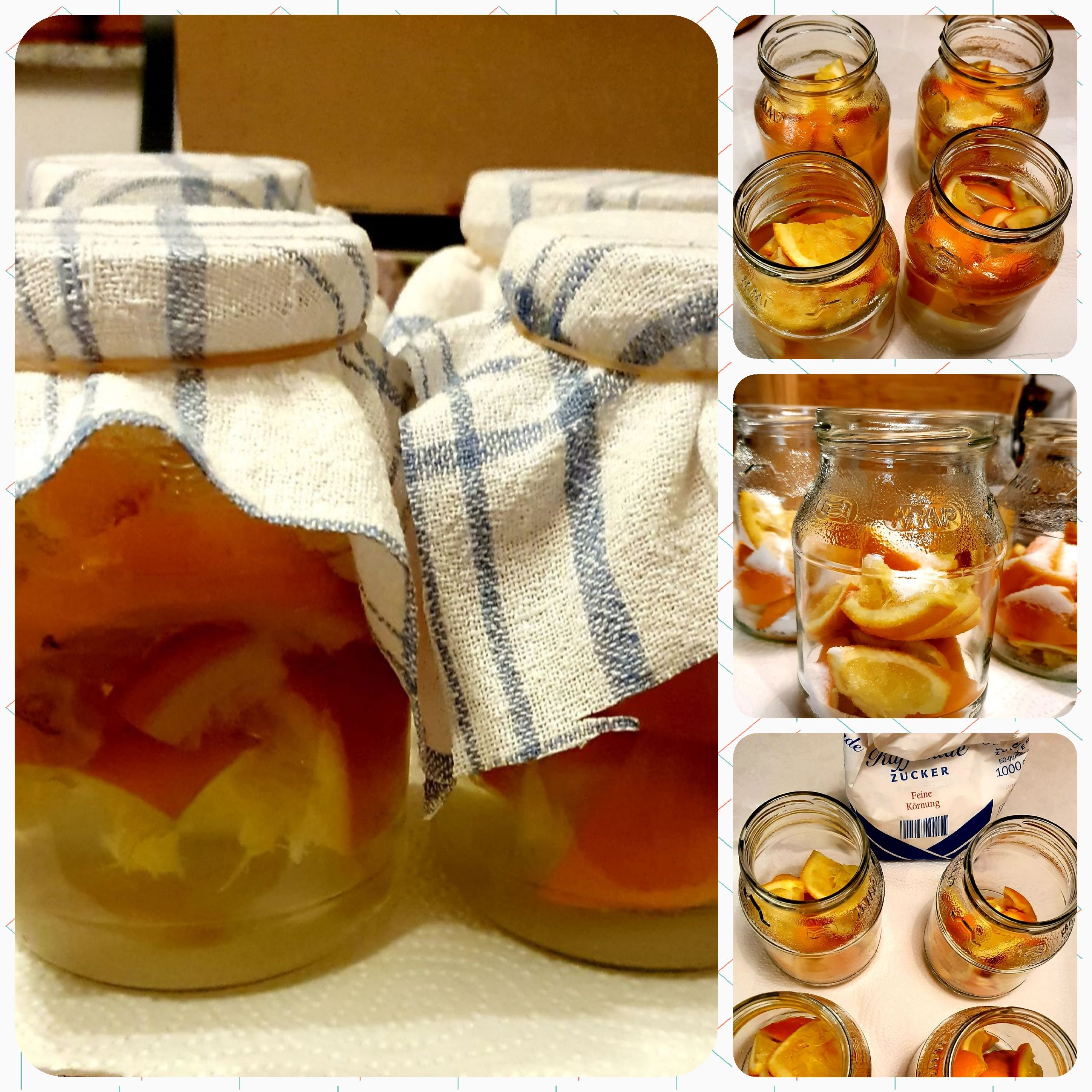 Tja … nix war’s mit dem Orangenessig! Die Orangenschalen schwammen oben und die Gläser standen in einem wenig beheiztem Zimmer … leider schimmelten einige Schalen. So musste ich alles entsorgen.