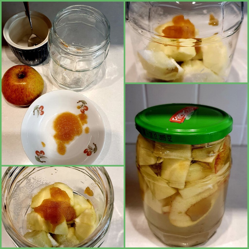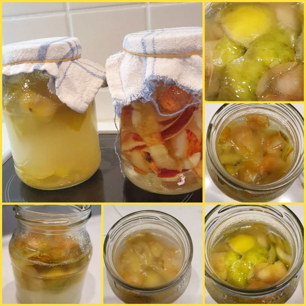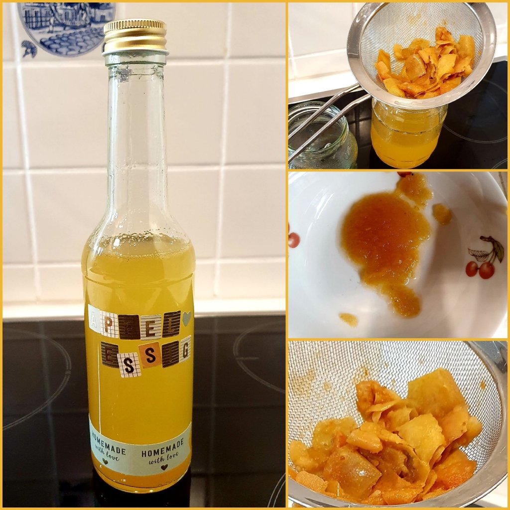 Orangenessig: Erneut setzte ich Orangenschalen an mit Wasser, etwas Saft, Zucker und Fruchtfleisch. Ich beschwerte diese mit zwei Schnapsgläschen und der Behälter kam in den Kühlschrank! Momentan ist der Geschmack leicht bizzelig und es riecht nach Alkohol. Update2: Ein kleines Stück Orange ist nach oben gedriftet und geschimmelt … Jetzt habe ich erst mal keinen Nerv mehr auf O-Essig.😬Apfelessig: Zusätzlich setzte ich Apfelschalen, Kerngehäuse, Fruchtstücke und etwas Zucker mit Wasser an. Die kamen in den Kühlschrank und der Inhalt wurde regelmäßig gerührt. Nach ein paar Tagen roch es gärig, die Mutter bildete sich und nach ca. 4 Wochen wurde alles recht sauer. Beide Essige haben die Farben der Apfelschalen, einmal gelber und einmal roter Apfelessig. Demnächst fülle ich die Essige in Flaschen. Sie halten dann etwa ein Jahr. Update2: Frisch abgefüllt nach 5 Wochen: Der Apfelessig schmeckt fein und mild. Auf dem mittleren Bild rechts seht Ihr die Apfelmutter. Damit setze ich gleich einen neuen Essig an.Update2: Frisch angesetzte Apfelstücke mit Wasser, Zucker und Essigmutter. Ich lasse den Schraubdeckel erst mal drauf und werde ihn später durch ein Tuch ersetzen.