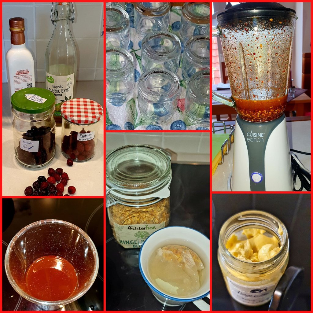 Rezept für 300 g CremeFettphase: 90 ml Hagebuttenöl erwärmen, insgesamt 12 g Bienenwachs und Sheabutter darin schmelzen, danach 18 g Emulgator hinzugeben, unter rühren etwas runterkühlen (auf ca. 50°C).Wasserphase: 180 ml starker Ringelblumentee mit einem Schuss Wiesenlabkraut-Tinktur auf ca. 50 C° erwärmen.Emulgieren: Den Tee in die Ölphase einrühren und so lange mit dem Stabmixer mixen, bis sich alles zu einer Creme bindet. Einige Tropfen ätherisches Rosenöl hinzugeben und in saubere Gläser füllen. Ein Küchenkrepp über die Gläser legen bis die Creme abgekühlt ist. Verschließen und im Kühlschrank lagern.Haltbarkeit 2 – 3 Wochen Ich habe einige Gläschen verschenkt und einige eingefroren.