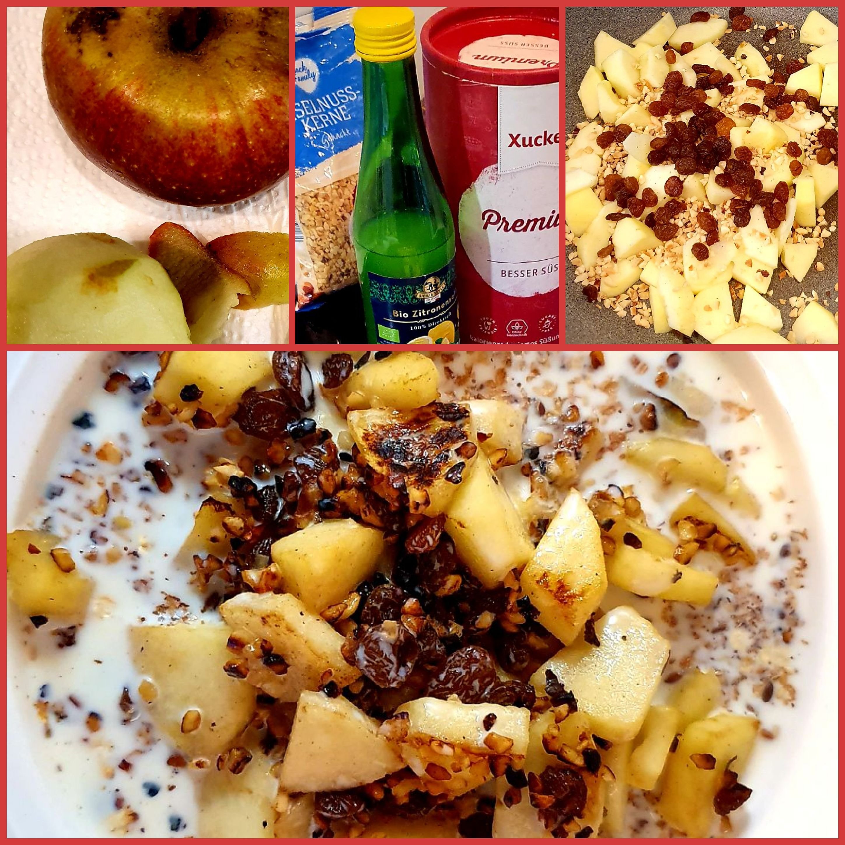 Was kann man mit Garten-Äpfeln so alles anfangen? Sie sind schön sauer und etwas mürbe. Und ungespritzt. Fragt mich nicht, wie die Sorte heißt. Es ist eine alte Apfelsorte, vom Geschmack ähnlich wie ein Boskopf.