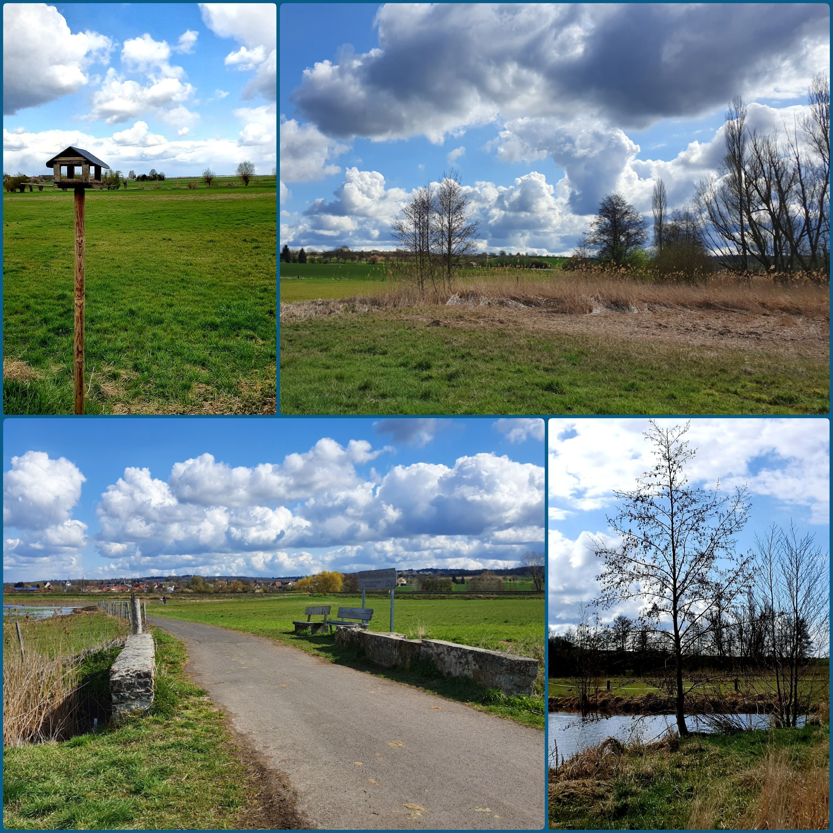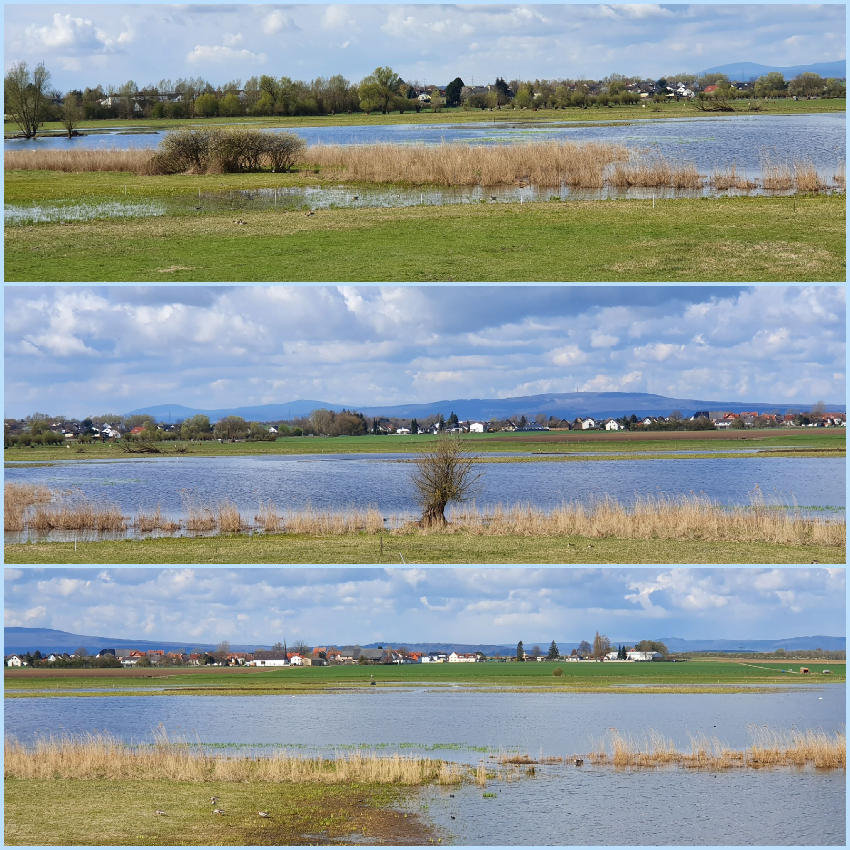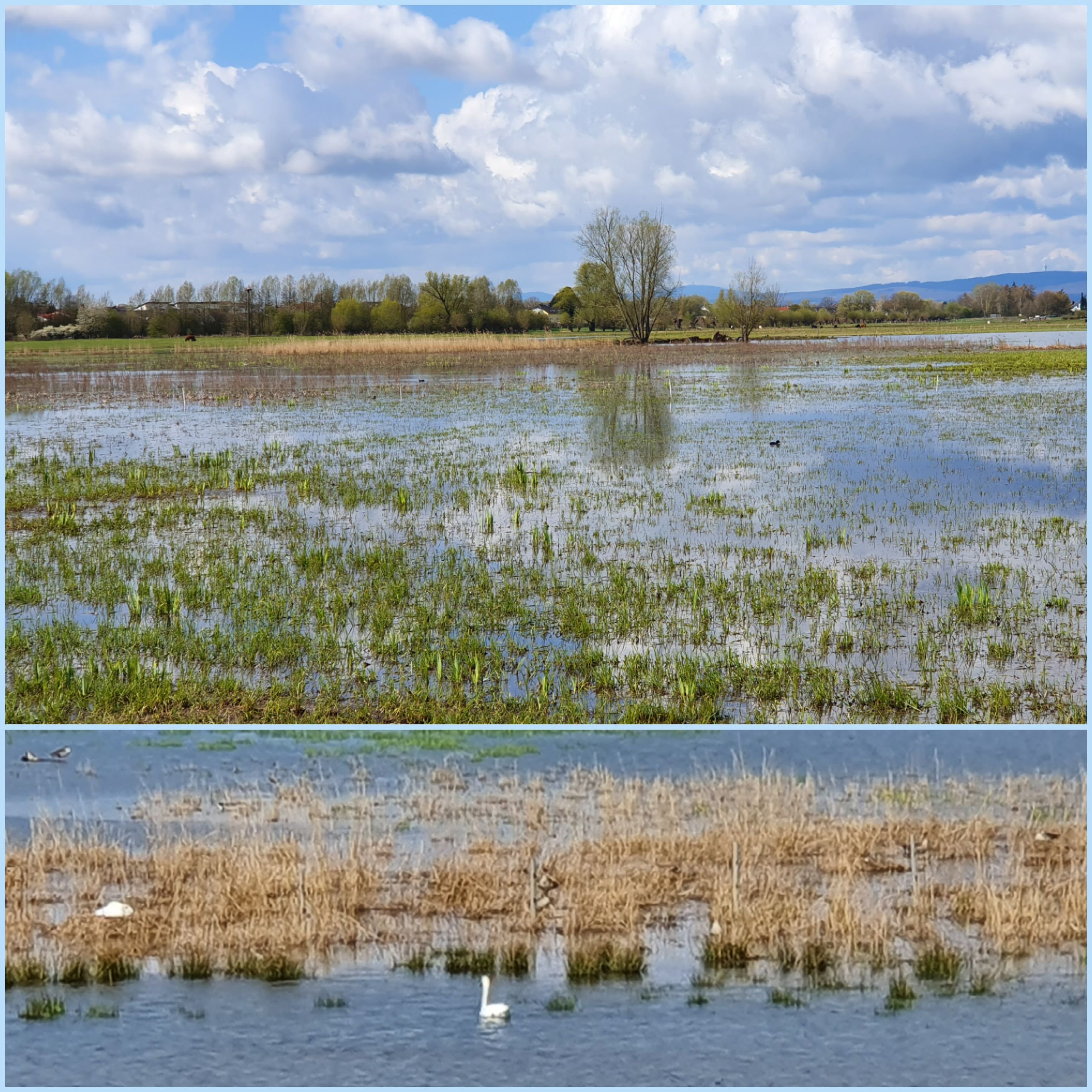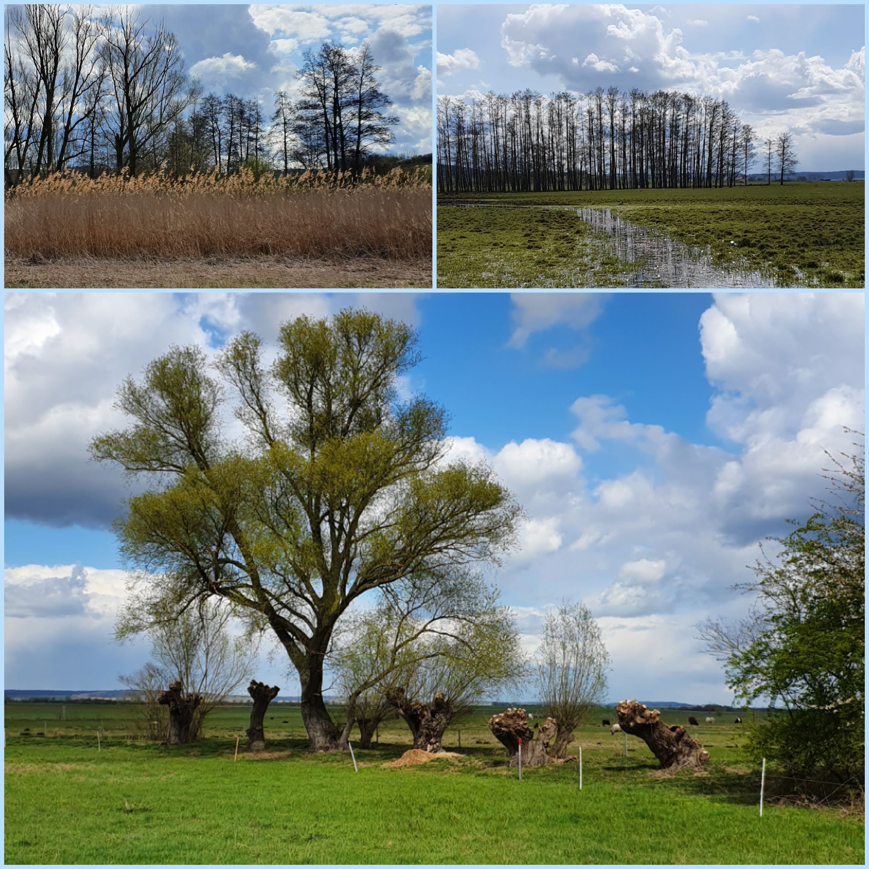 Naturschutzgebiet mit Feuchtwiesen, Auen, vielen Störchen, Gänsen, Enten, Wattvögeln, Rindern, Rehen, Bibern, Nutrias und seltenen Pflanzen. Unser Auto stellten wir am Parkplatz Bingenheimer Ried ab und liefen einmal um das Gebiet herum, wir waren etwa zwei Stunden unterwegs für ca. zehn Kilometer. Unterwegs gab kleine Stationen mit Erklärungen, außerdem gab es auch ein paar Bänke, die zum Verweilen einluden. Das raue Aprilwetter mit Wind, Sonnenschein und ein paar Schneeflocken ließ uns denken, wir seien am Wattenmeer.