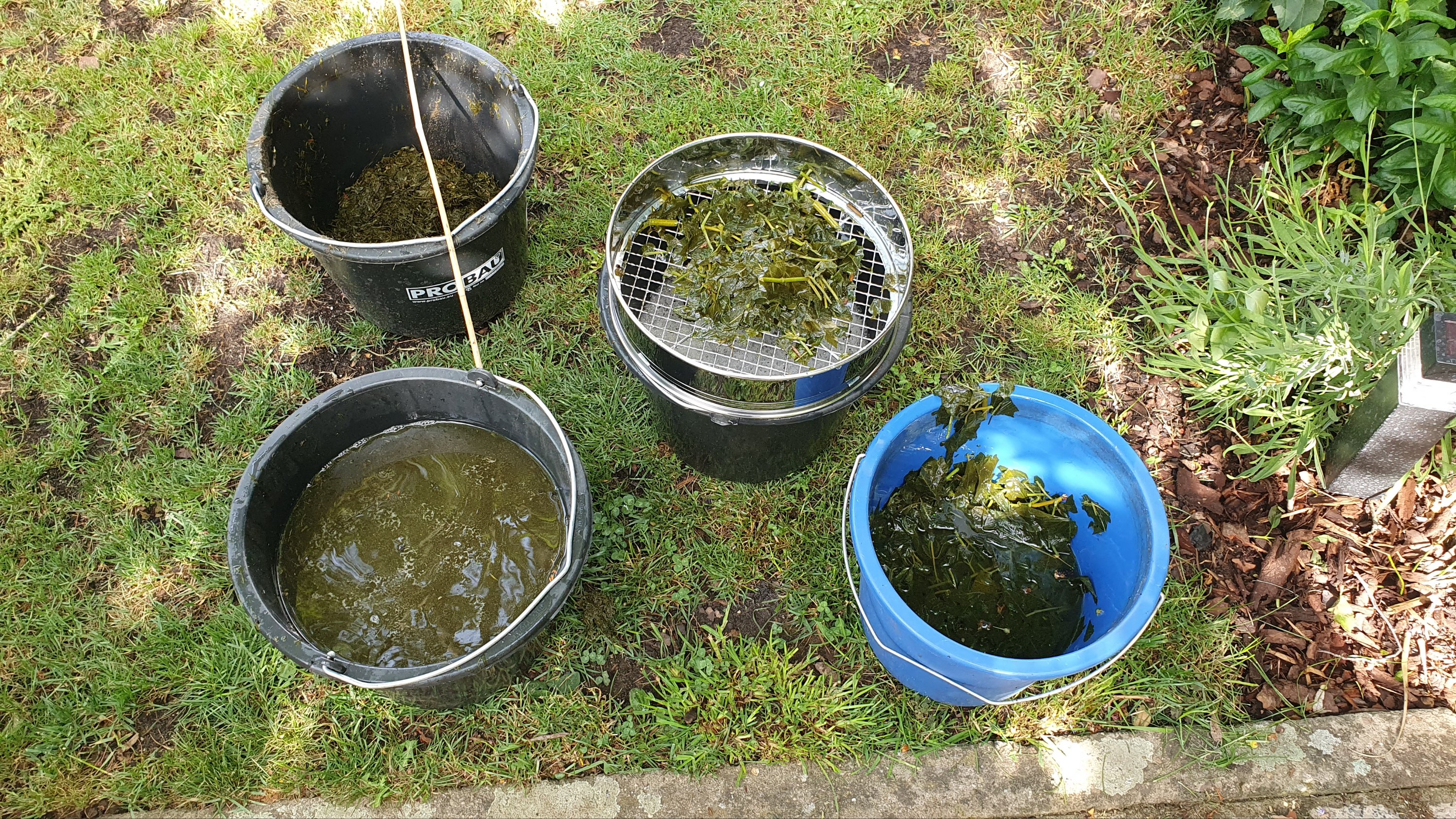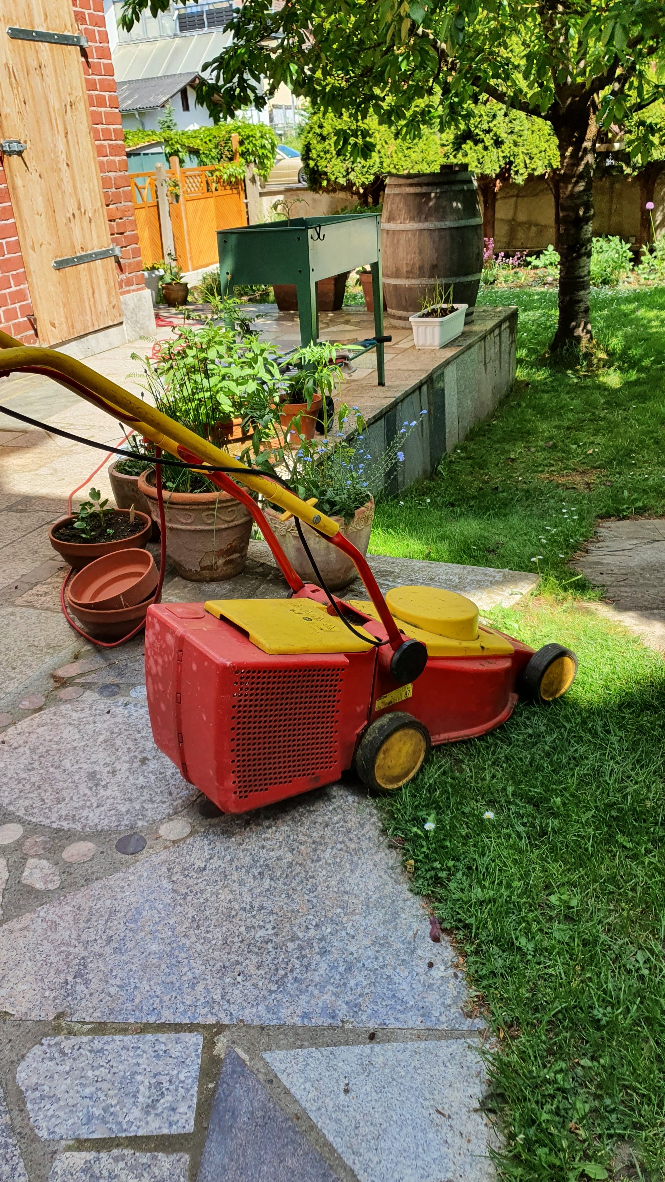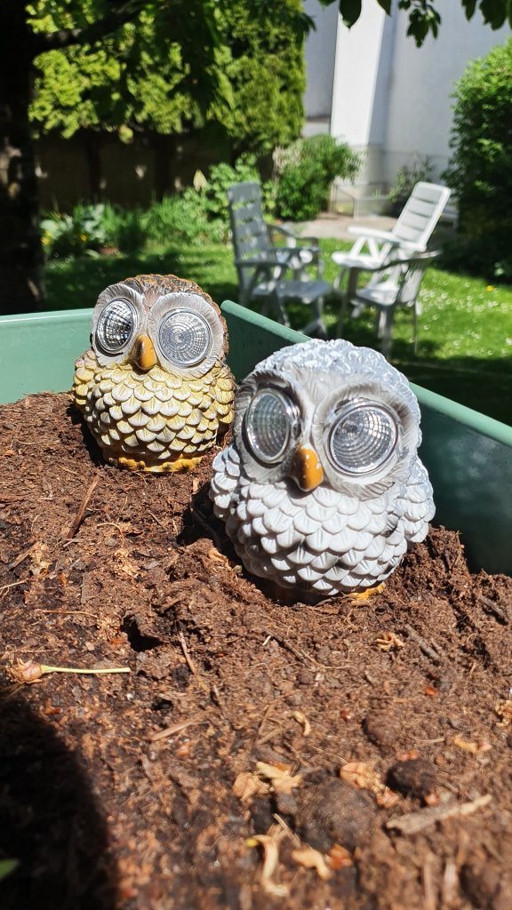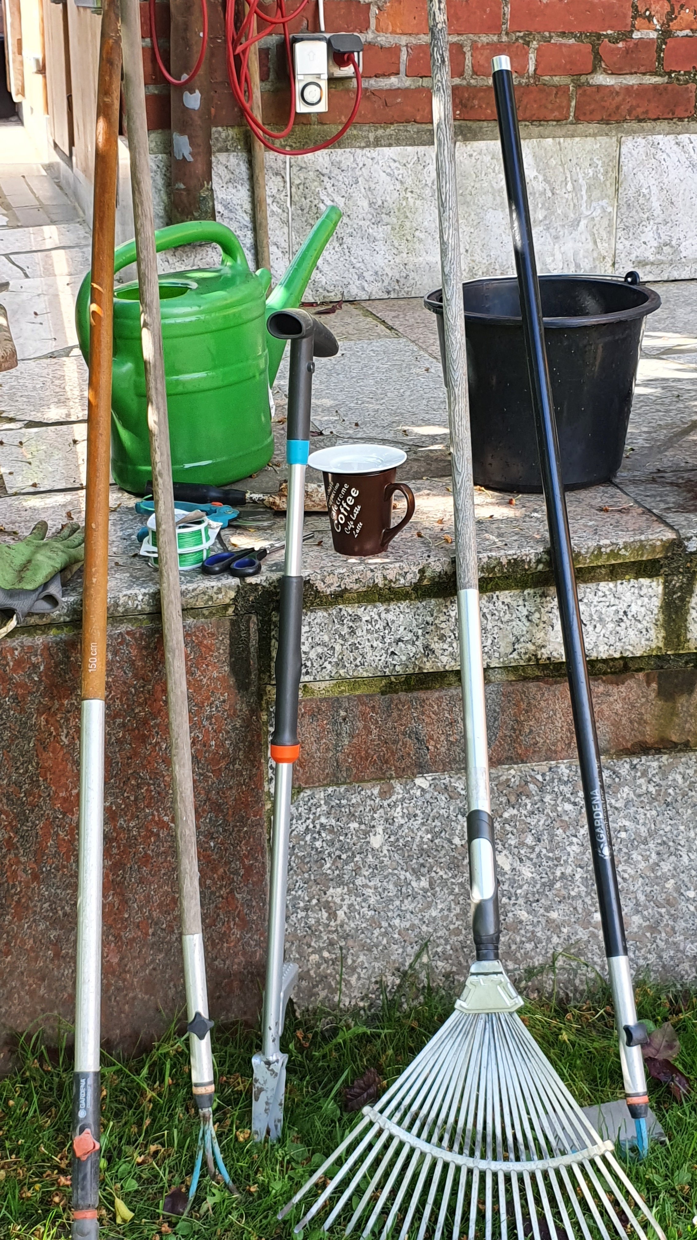 Frisch ans Werk!Rasen mähen inklusive Kanten schneidenEin Teil davon wird zu Jauche vergoren.Die Lieferung ist pünktlich eingetroffen: Siebe für Jauche und Kompost.Pflanzenjauche stinkt – was tut man nicht alles! Jauche aus Holunderblättern soll Wühlmäuse vertreiben. Genauso wie geronnene Milch. Hatte tatsächlich vergessene Milch im Kühlschrank und ins Mauseloch gekippt. Ich hab‘ länger nix von der Maus gesehen. Vielleicht ist sie erstunken? Jetzt kommt noch Holunderjauche drüber, dann dürfte sie erledigt sein. Hoffe ich. Das andere ist Rasenjauche und dient als Dünger.Gequollene Kokosfasern verwende ich als Mulch für Topfpflanzen.Beete gesäubert und Funkien und Farne unter die Bäume gesetzt. Und etliche Büsche zurückgeschnitten.Gedüngt (mit Jauche), eingetopft, umgetopft, gepflanzt und gesät.Wassertanks gereinigt und frisch befüllt.Wege und Hütte ausgefegt und ständig aufgeräumt.Es klingelt sanft vor sich hin. Leider vertreibt es weder Tauben und Mäuse noch Läuse.Solar-Eulen aufgestellt, die Äuglein glühen schön bei Nacht.Schwarzäugige SusanneWindrad ArbeitsplatzGartenmöbel geschleppt und gereinigt.