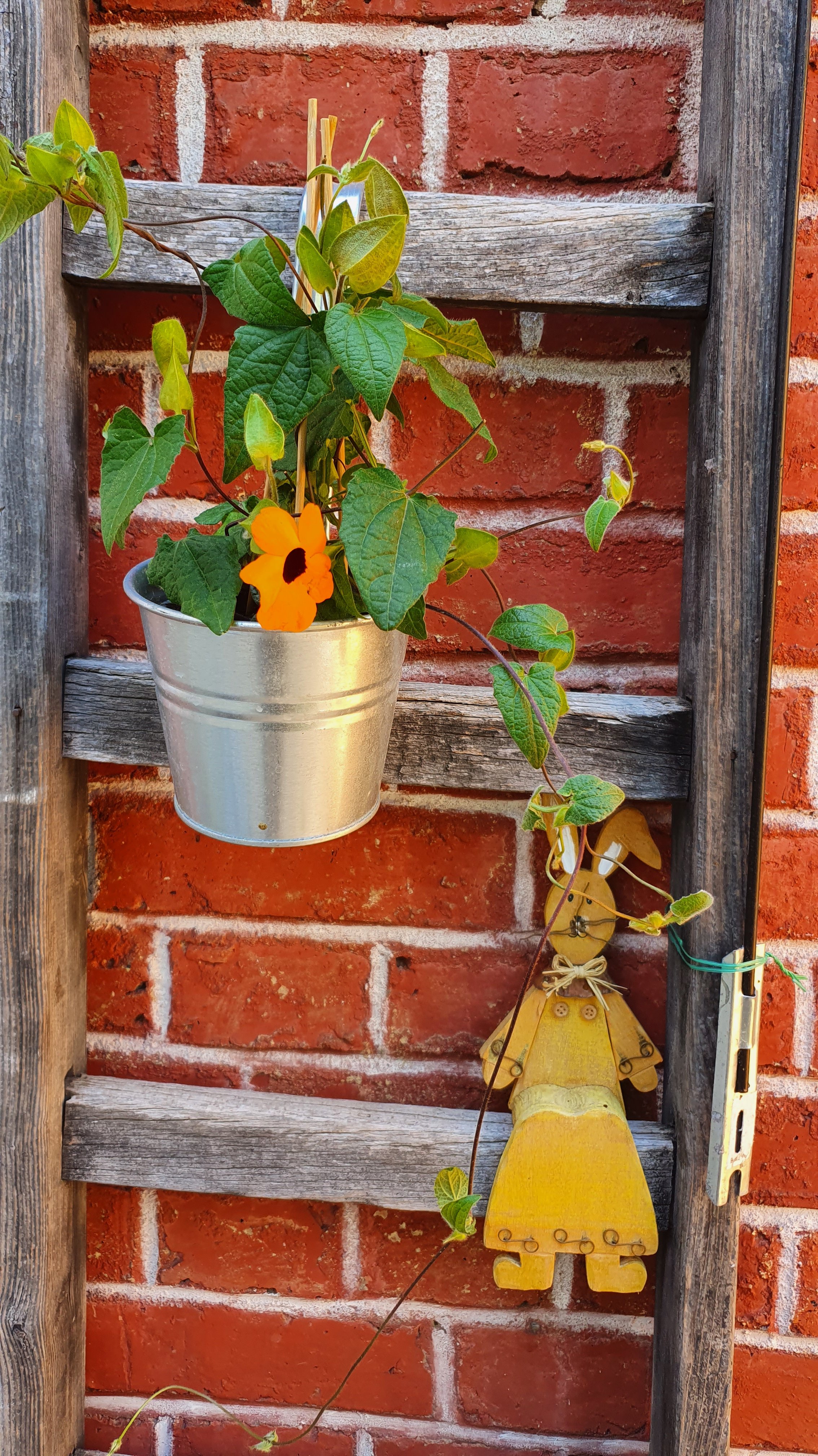 Es war an der Zeit, den ersten Betonkübel mit kleinen Zweigen, Blumenerde + Kokosfasern zu bestücken. So konnte ich die vorgezogenen Bohnen einpflanzen. Einige frische Zweige steckte ich tief in die Erde und verwurstelte sie mit Draht und Schnur zum Rankgitterl. Die Bauanleitung auf YouTube wirkte irgendwie einfacher … 😂