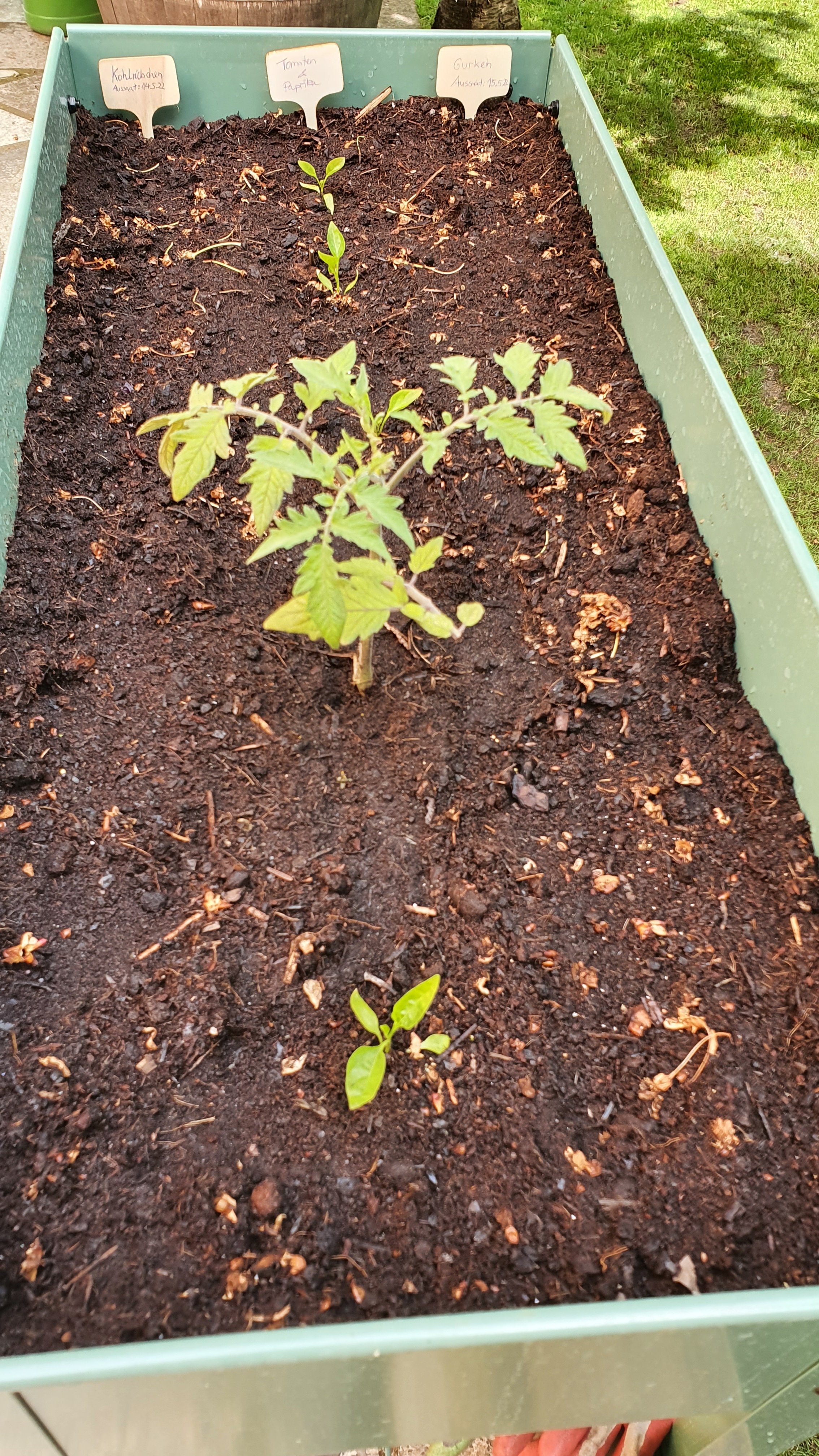 Das Hochbeet wurde mit Erde etwas aufgefüllt, eingesäat, bepflanzt, begossen und abgedeckt. Wahrscheinlich wird das Beet aus allen Nähten platzen. Also, auf die paar Quadratmeter habe ich jetzt diese Pflanzen/Saaten: Lauch, Zwiebel, Knoblauch, Möhren, Rettich Pastinaken, Kohlrabi, Eissalat. Bin gespannt, was sich wie entwickelt.😊Die Kartoffeln vom Januar entwickeln sich prächtig, also zumindest das Grün. Ich habe fleißig gehäufelt. Und die Saubohnen vom Februar keimen schon, klasse!