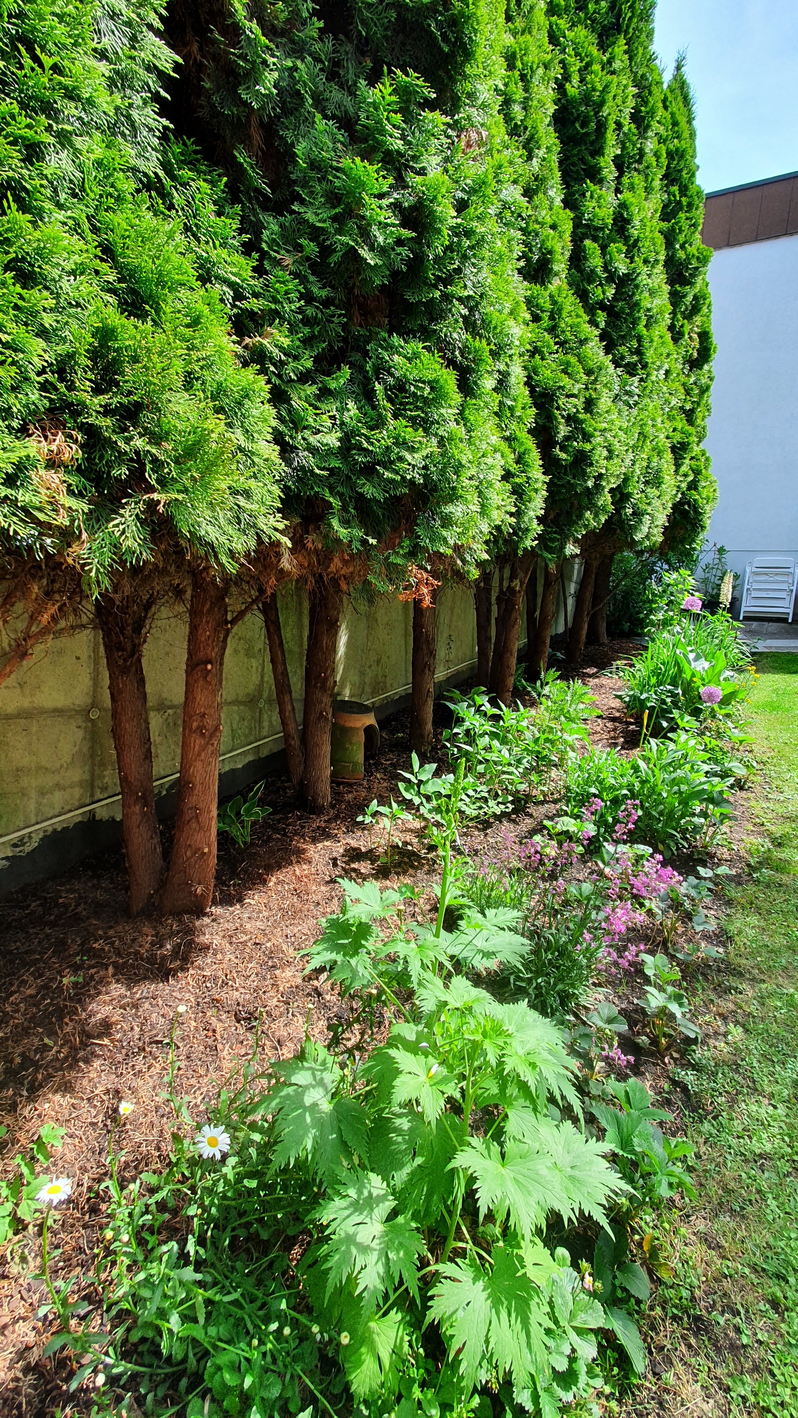 Diesmal mit Hilfe eines Gärtners ging’s einen ganzen Tag ans Werk: Unkraut rupfen, frischen Rindenmulch unter die Büsche und Bäume verteilen, den Rasen vertikutieren, düngen und (später) nachsäen, Schönheitsschnitte an einigen Bäumen + Büschen. Natürlich nur im Rahmen des Möglichen,wegen der brütenden Vögel. Unsere „grüne Wand“ zum Nachbarn, also die Koniferen, sind ganz schön ramponiert, überall bröseln die braungewordenen Zweige und Blätter runter. Außerdem breiten sie sich unten sehr aus, so dass meine Stauden, die davor wachsen, zur Seite gedrückt werden. Also haben wir das kahle Geäst unten weggeschnitten – ich finde, es sieht besser aus denn je.