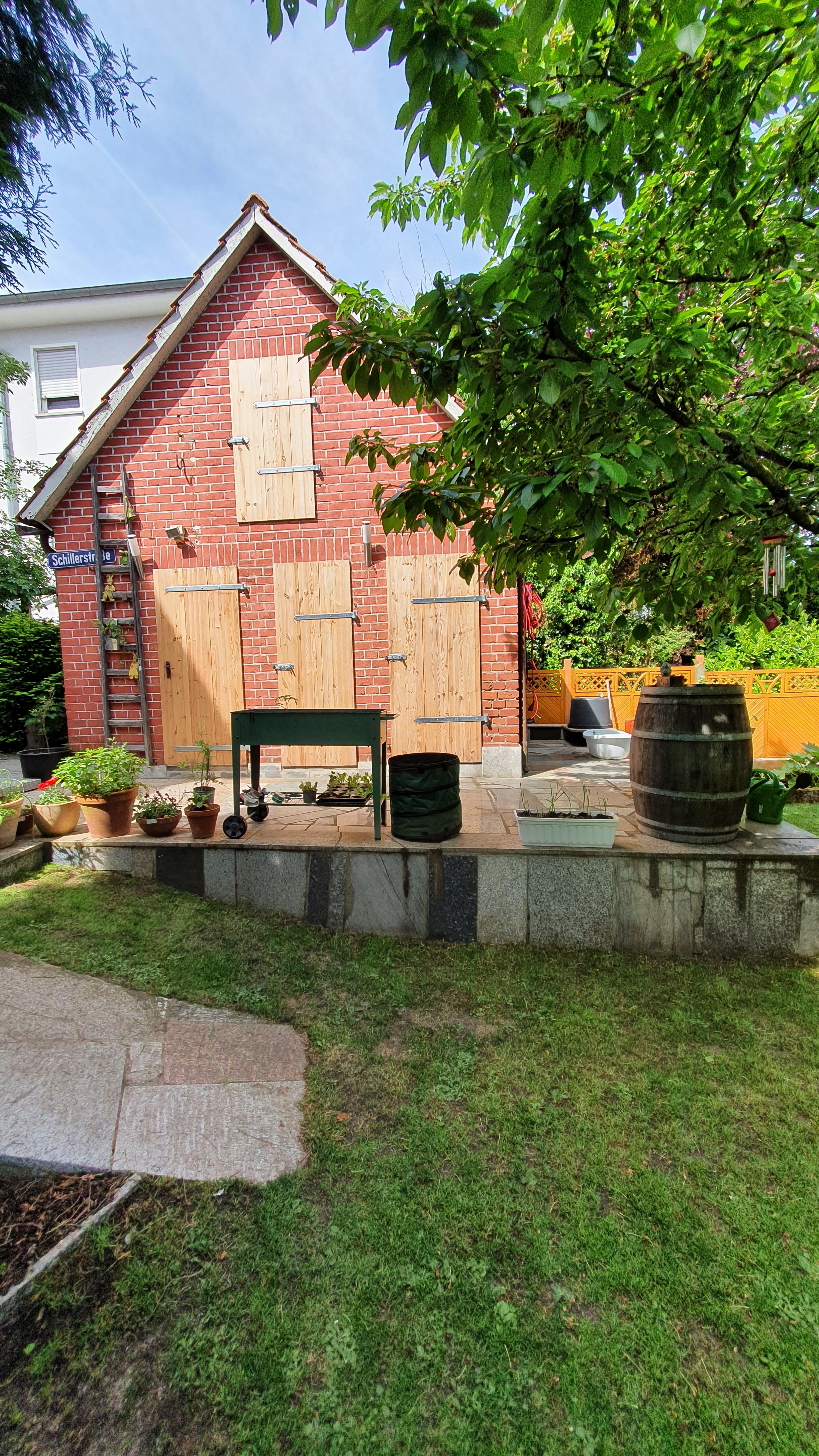Schuppen: links die Küche, in der Mitte das Plumpsklo, rechts Schuppen für Gartengeräte, Dünger, Samen etc. Sommerküche: Schränke für unser ausrangiertes Besteck und Geschirr, Spüle, Kühlschrank, Gasherd und darauf steht der Eintopf.Der Sitzplatz ist schön im Schatten – gleich neben der Küche. Kaffee ist auch schnell gekocht.