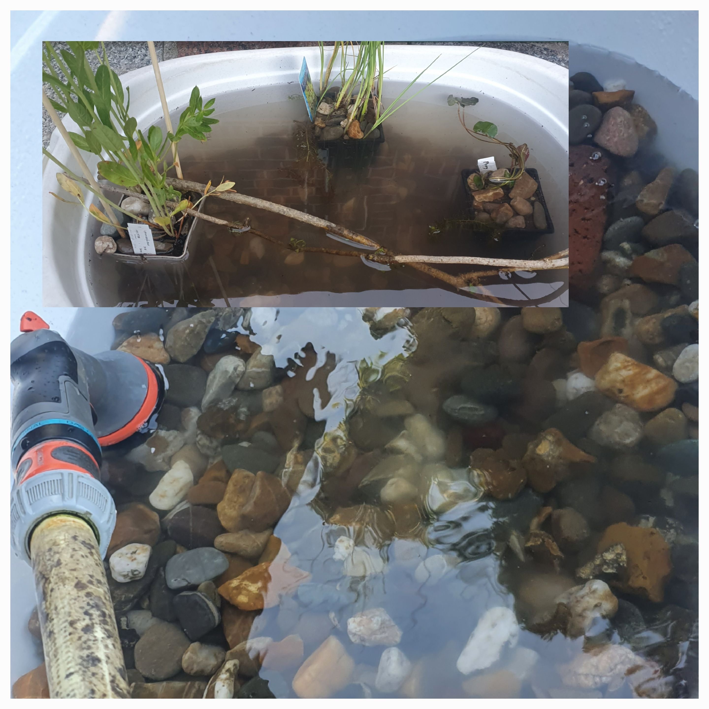 Die Pflanzen bleiben im Container und werden mit Kieselsteinen beschwert. Sie haben verschiedene Bedürfnisse: Die Seerose sollte ihreBlätter schwimmen lassen, Blutweiderich und Pestwurz sind Ufergewächse, daher stehen sie erhöht am Rand. Für unterschiedliche Ebenen sorgen Ziegelsteine und der Kies.