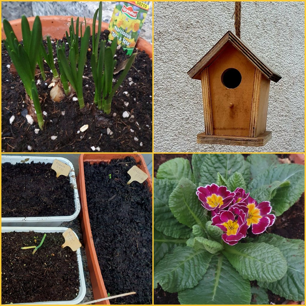 Die Frühblüher sind eingepflanzt und die Krokusse kommen bereits raus.Der Nistkasten ist bereit und im Frühbeetkasten wurden Feldsalat, Portulak und Brokkoli in die Kästen gesät.