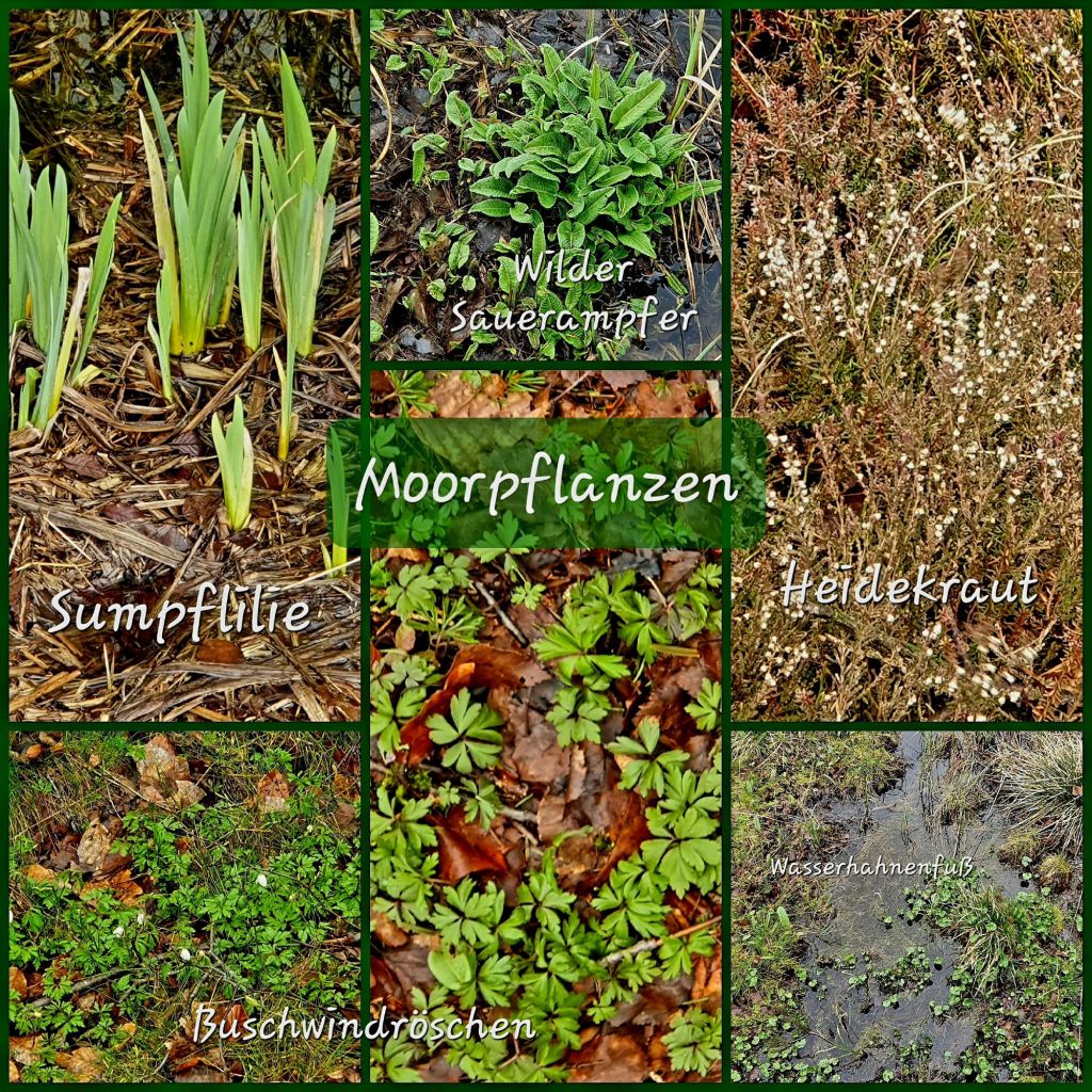 Letztes Jahr hatte ich eine alte Plastikwanne mit Steinen und Wasserpflanzen ausgestattet. Leider ist der Kunststoff über den Winter porös geworden. Daher besorgten wir uns einen Holzbottich und siedelten die Pflanzen um und kauften noch einige hinzu: