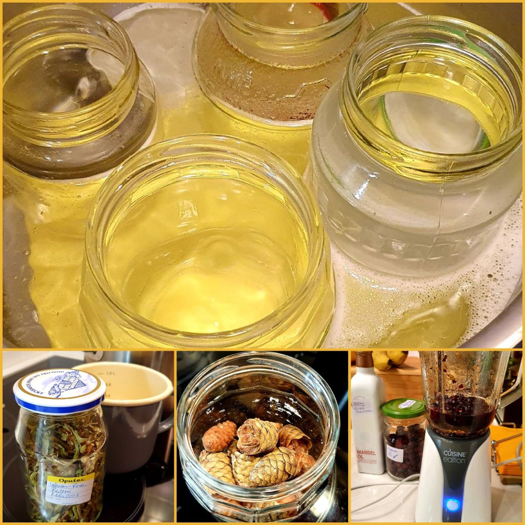 Ein Freund wünschte sich etwas gegen seine starken Verspannungen im Schulter- und Nackenbereich. Also recherchierte ich, was da hilfreich sein könnte und passte es dem an, was ich im Kräuterschrank vorrätig hatte. Zudem fiel als „Nebenprodukt“ ein Öl und eine Salbe gegen müde Augen und Augenringe dabei ab.