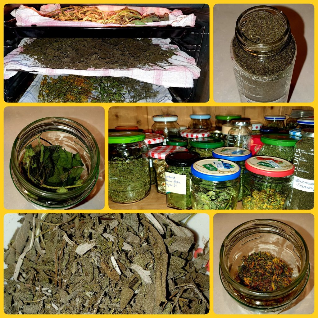 Die letzten Wochen habe ich eine Menge Pflanzen geerntet. Überall lagen (und liegen/hängen immer noch) Kräuter zum Trocknen aus. Bevor ich den Überblick verliere, kurbelte ich die Schnelltrocknung mittels Ofen an: Die Kräuter wurden bei 40°C mit leicht geöffneter Tür getrocknet. Zum Schluss bleibt nur noch ein kleines Häuflein Pflanzendroge übrig.