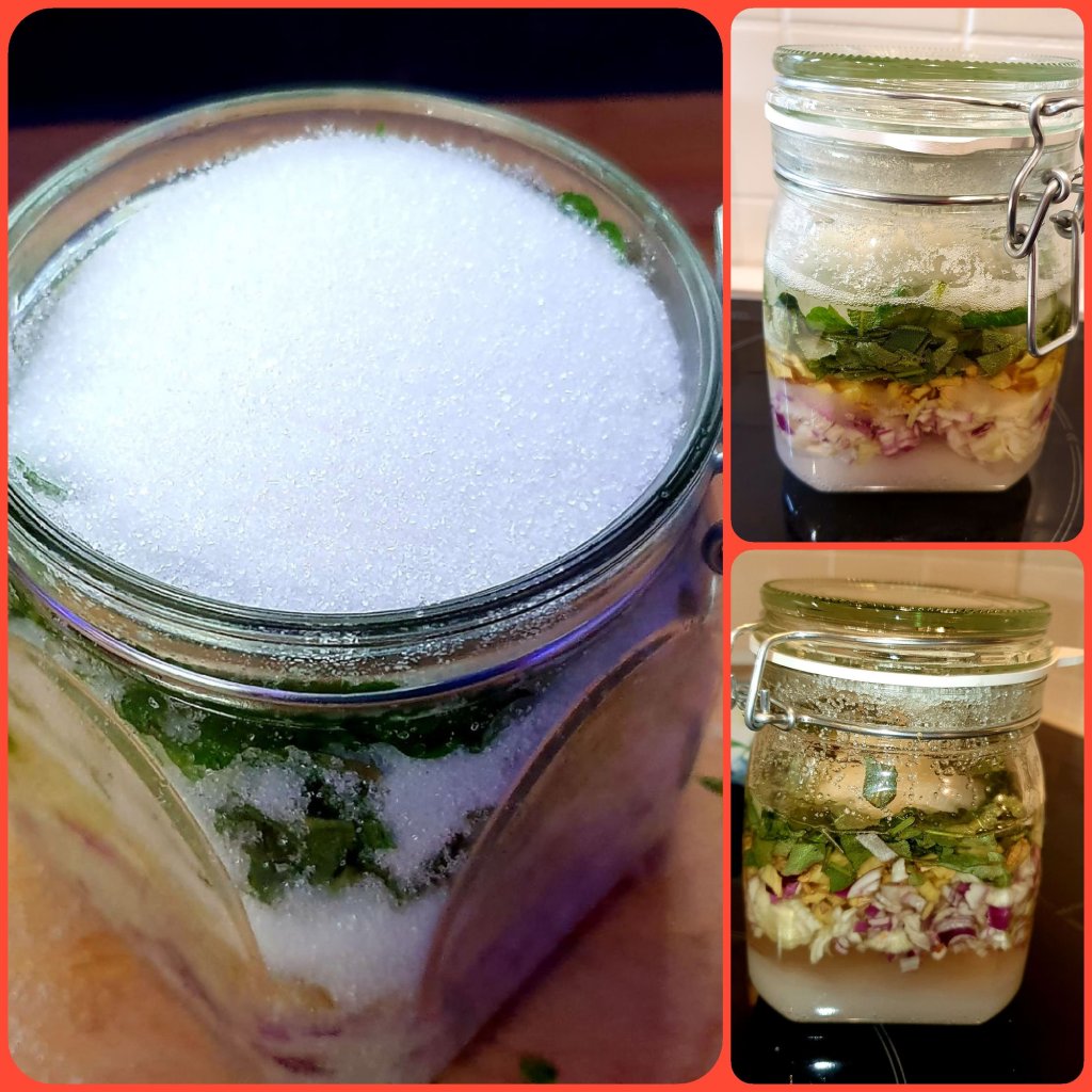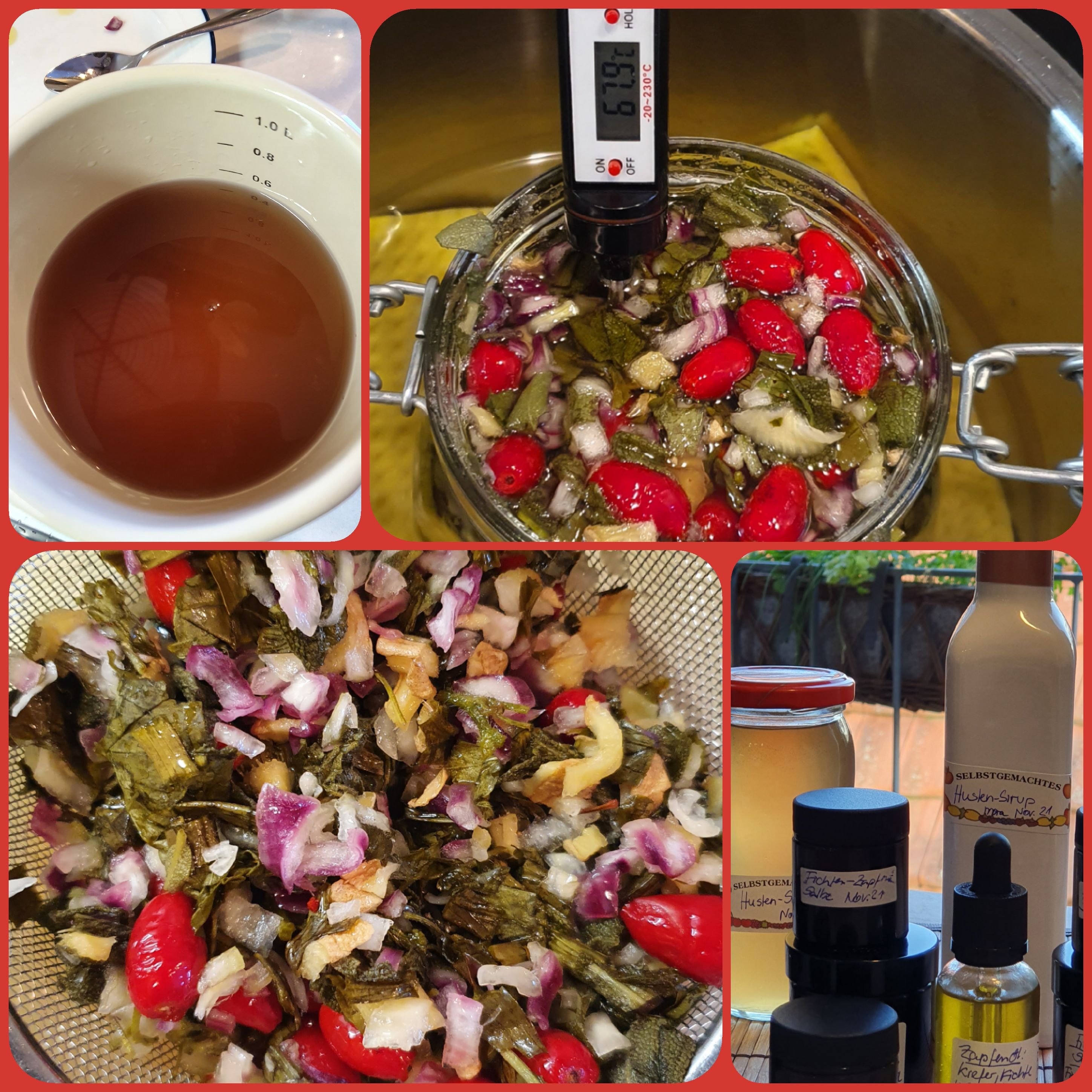 Kleingeschnittene Zwiebeln, Ingwer, einige Kräuter aus dem Garten (Malve, Minze, Melisse, Salbei, Verbene) abwechselnd mit Zucker im Glas schichten. An einem sonnigen Platz ausziehen lassen. Es bildet sich relativ schnell Flüssigkeit. Beim Laufen entdeckte ich noch Spitzwegerich und eine Handvoll Hagebutten. Diese wurden mit einer Schicht Zucker dazu gegeben.Nach ca. eine Woche erwärmte ich das Ganze + 1 Glas Wasser + Zitronensaft. Nach einer Stunde siebte ich die Flüssigkeit ab und füllte sie in sterile Gläser. Aufbewahrt wird der Sirup im Kühlschrank. Mit der Haltbarkeit weiß ich nicht so genau. Zucker ist ein natürliches Konservierungsmittel. Daher dürfte der Sirup mindestens 3 Monate haltbar sein, zumindest wenn er unangebrochen ist. Ich werde es testen.