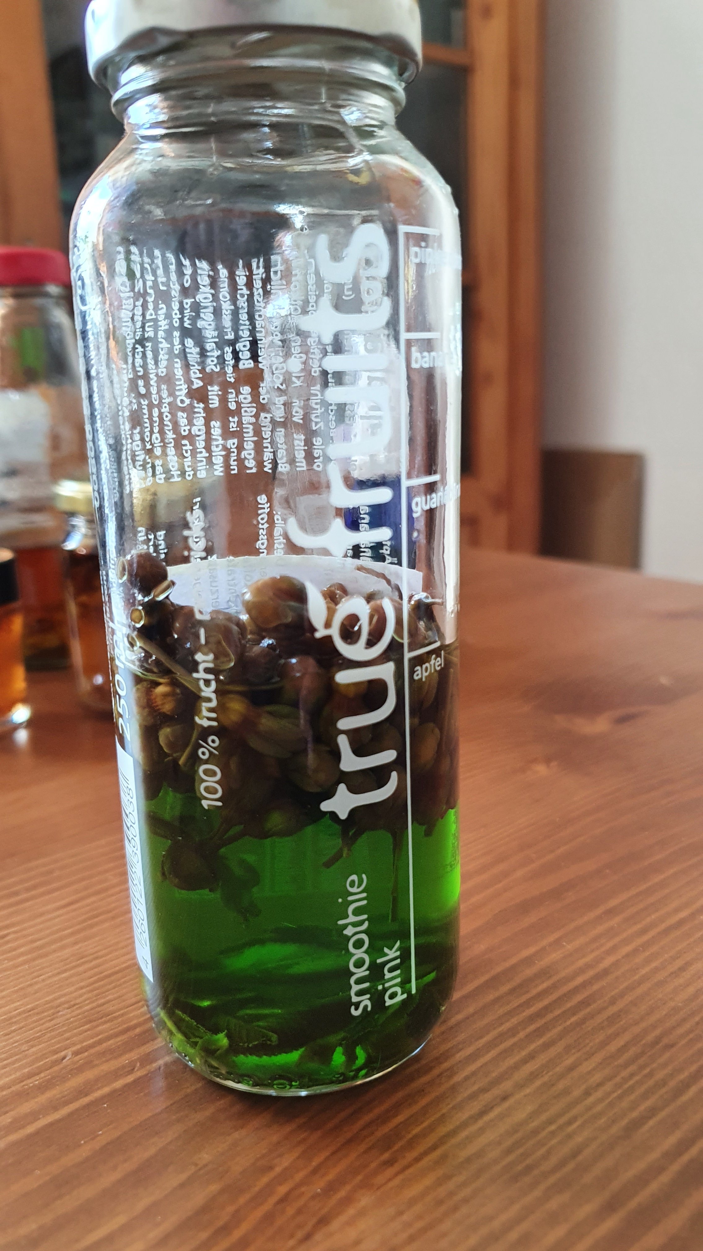 Zudem habe ich eine Tinktur aus Pappelknospen und eine aus jungen Frühjahrskräutern in dunkle Tropfflaschen abgefüllt.
