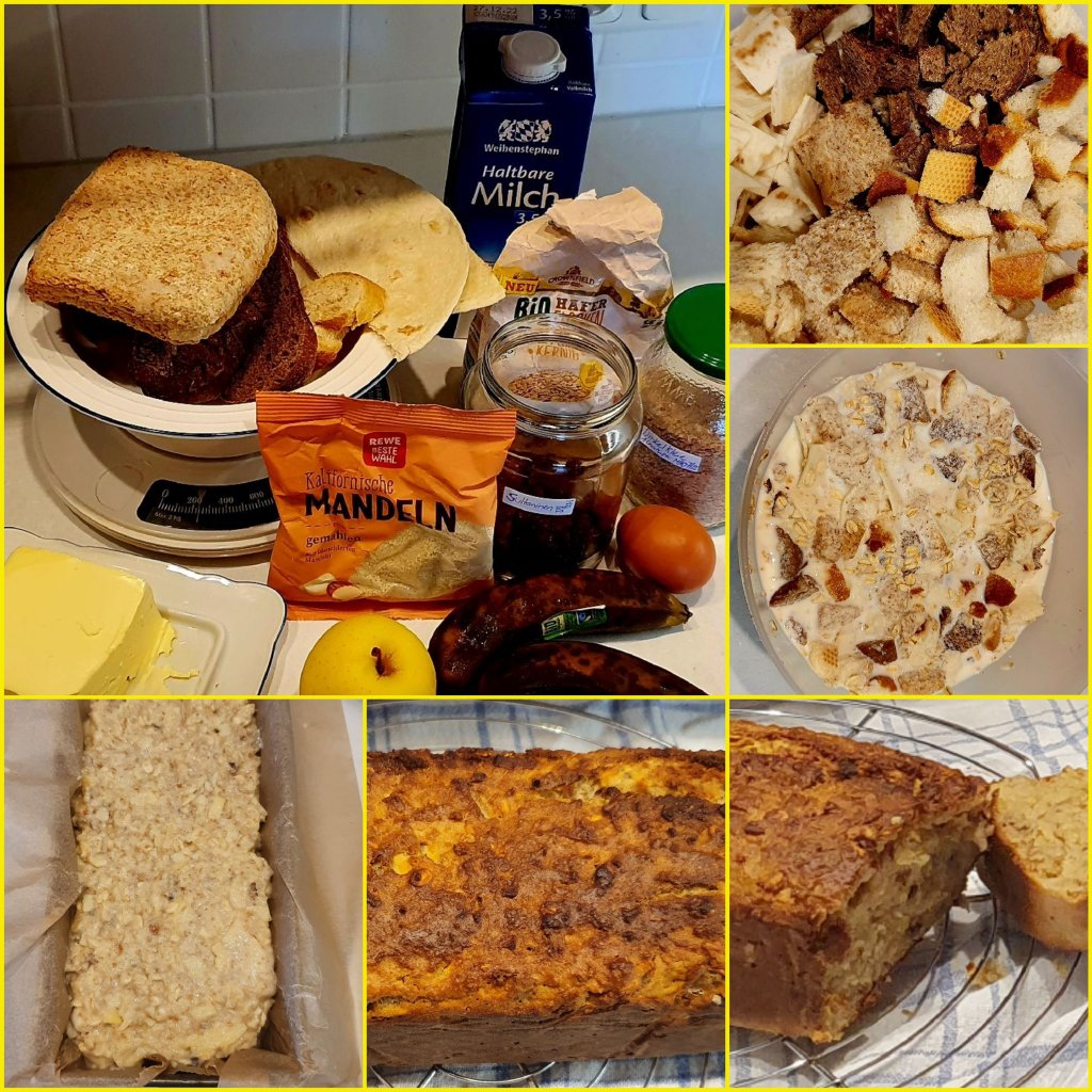 Rezept: 500 g Brotreste würfeln und in 500 ml Milch ein bis zwei Stunden einweichen, die überschüssige Milch abgießen, 100 g Zucker, Obst nach Wahl (ich habe zwei Äpfel reingeschnippelt), eine Tüte gemahlene Mandeln, zwei Eier, etwas Backpulver, Haferflocken und Vollkornmehl für die Konsistenz und dann … Ab in den Ofen für eine Stunde bei 180 °C! Das Kuchenbrot ist megasaftig und man kann alles verwenden, was man übrig hat: Obst, Saaten, Trockenfrüchte, Nüsse, Schoki usw. Es ist höchstens das Fett der Nüsse drinnen und wenig Zucker. Eine vegane Variante funktioniert ebenso mit Ei-Ersatz oder Apfelmus und Pflanzenmilch.