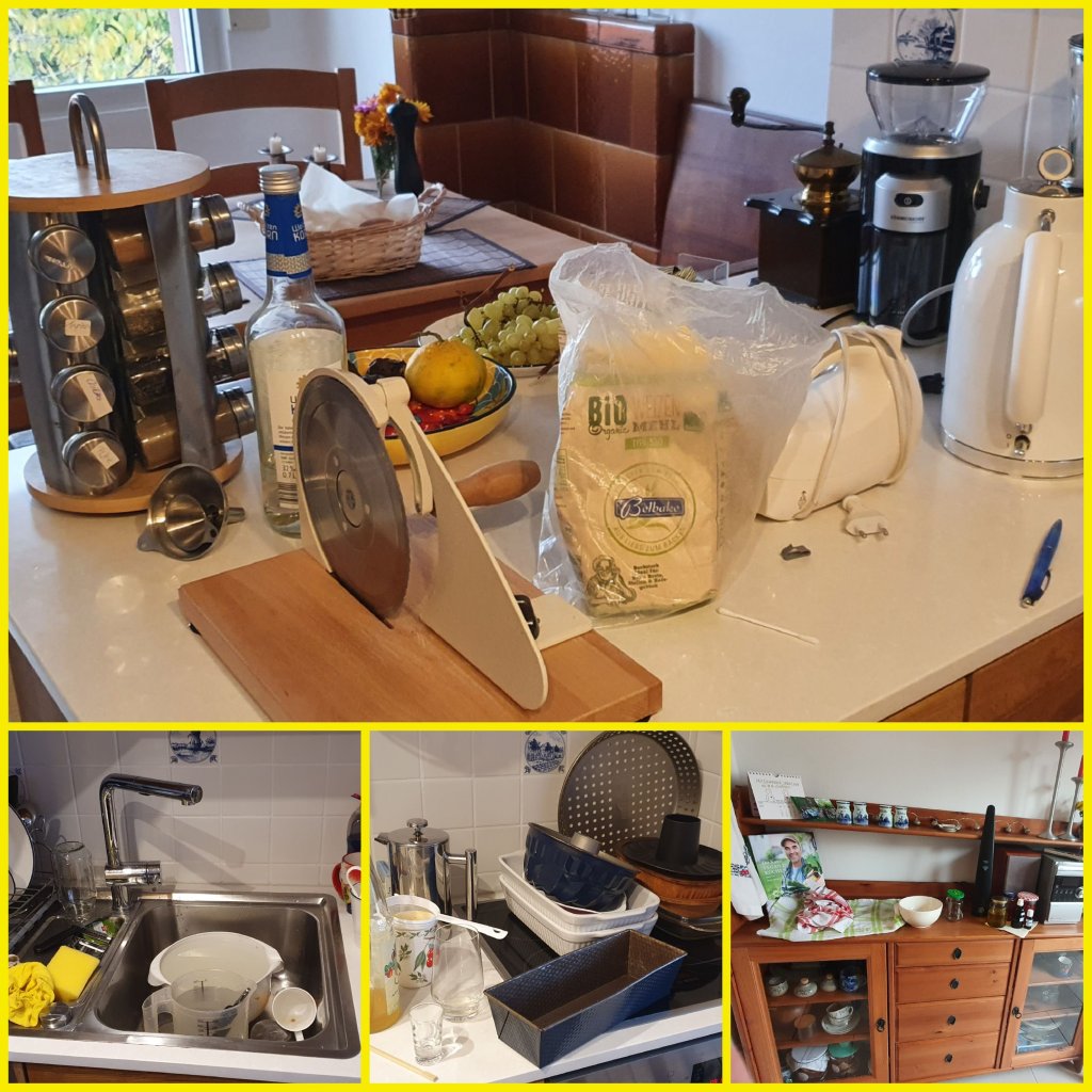 Wenn ich in der Küche werkele, putze ich zwischendurch die Flächen, spüle und räume auf. Trotzdem sieht es leicht nach Schlachtfeld aus.