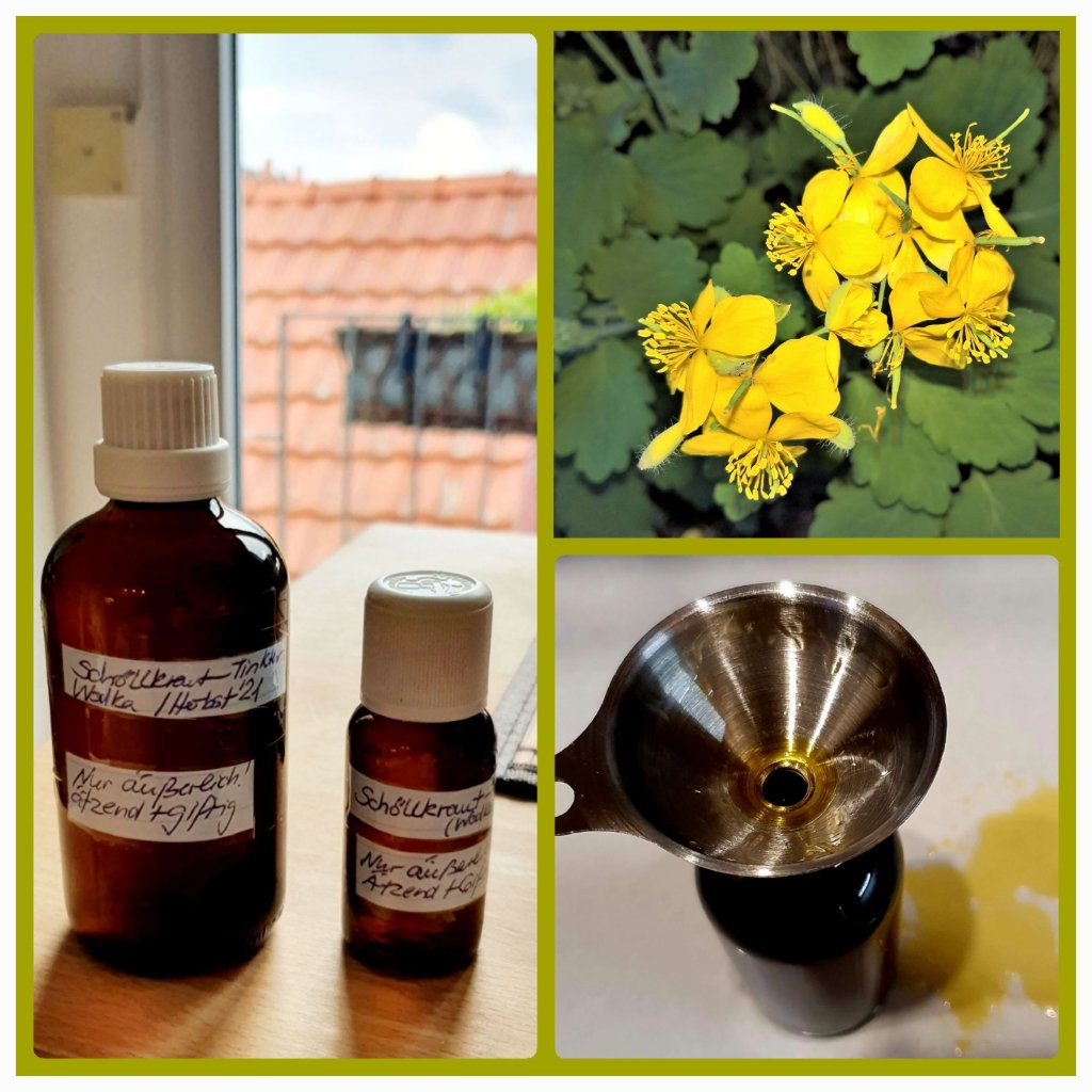 Zunächst war die Tinktur dran, die am längsten im Schrank steht: Seit 2021 wartet das Schöllkraut auf seinen Einsatz. Die Farbe ist echt gut, gelb-grün. Da es leicht giftig und ätzend ist, ist es nur für die äußere (!) Anwendung gedacht. Äußerlich soll es, mehrmals täglich aufgetupft, gegen Warzen und Hühneraugen helfen. Blog übers Schöllkraut: https://monika-rauch.com/2022/11/06/schoellkraut/Bei der Mazertion werden Pflanzenteile in Wasser (Tee), hochwertigen Ölen, Essig, Honig, Zucker, Alkohol … (Tinkturen aus: Korn, Wodka, Rum, 98%igem Alkohol) ausgezogen. Die Mazerate aus Öl können warm oder kalt ausgezogen werden. Ich habe hier Öle mit Schafgarbe Johanniskraut, Hagebutten und Tinkturen mit verschiedenen Kräutern abgesiebt, abgefüllt und etikettiert.