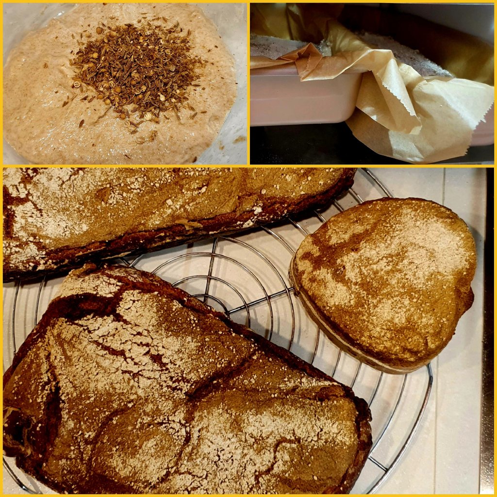 Den Sauerteig hatte ich mit Dinkel-Vollkornmehl vorbereitet. Die Zutaten für den Teig sind: – Anstellgut – Weizen- und Roggenvollkornmehl, sowie etwas helles Weizenmehl – Wasser – Salz.Teig (teilweise) mit Koriandersamen und Kümmel würzen und über Nacht im Kühlschrank „kaltgaren“ lassen. Morgens wird das Brot gebacken und verspeist.