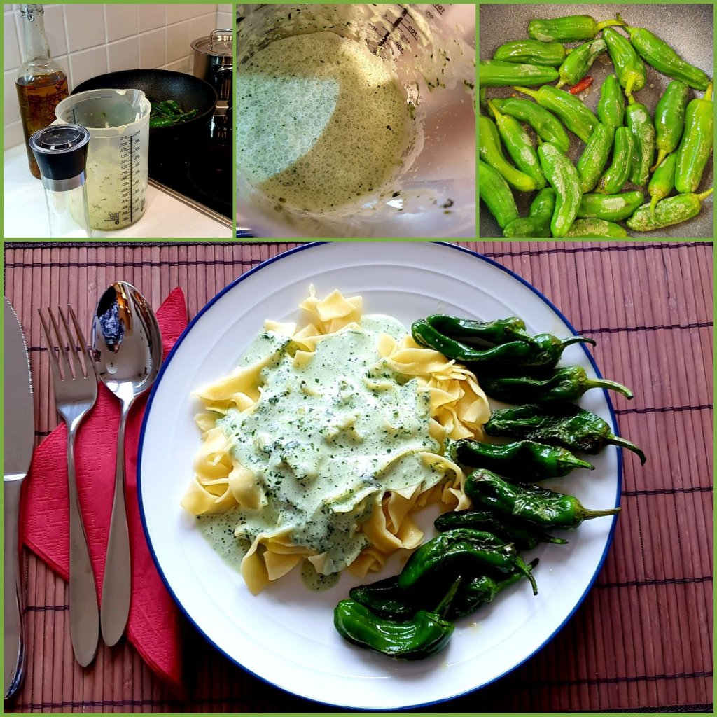 - 1/2 Saure Sahne mit Kräutern und Salz verrühren (ich habe frische Vogelmiere verwendet)