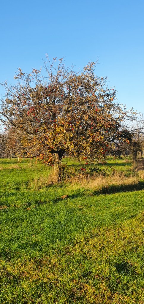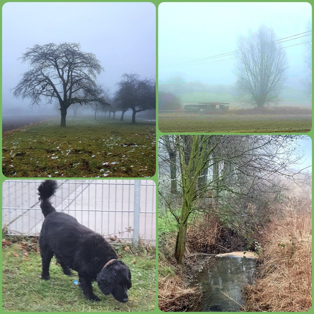 Nach einem milden November wurde es im Dezember doch kälter und lange Zeit war der Himmel trüb und verhangen. Das hatte sich auch auf meine Stimmung ausgewirkt. Kaum schien die Sonne, schnappte ich mir Rusty und machte einen langen Spaziergang. Gut, dass ich wasserundurchlässige Schuhe habe, denn die Wiesen sind recht feucht. Rusty war voller Lebensfreude, besonders als ich noch das eine oder andere Äpfelchen warf. Zwischendurch wälzte er sich im Gras und knatterte vor sich hin. Und ehrlich, am liebsten hätte ich es ihm nachgetan. Hab‘ mich aber gerade noch beherrschen können. Auch ohne, dass ich mich auf dem Boden gewälzt habe, tat mir die Natur sehr gut. Ich war rundum zufrieden.