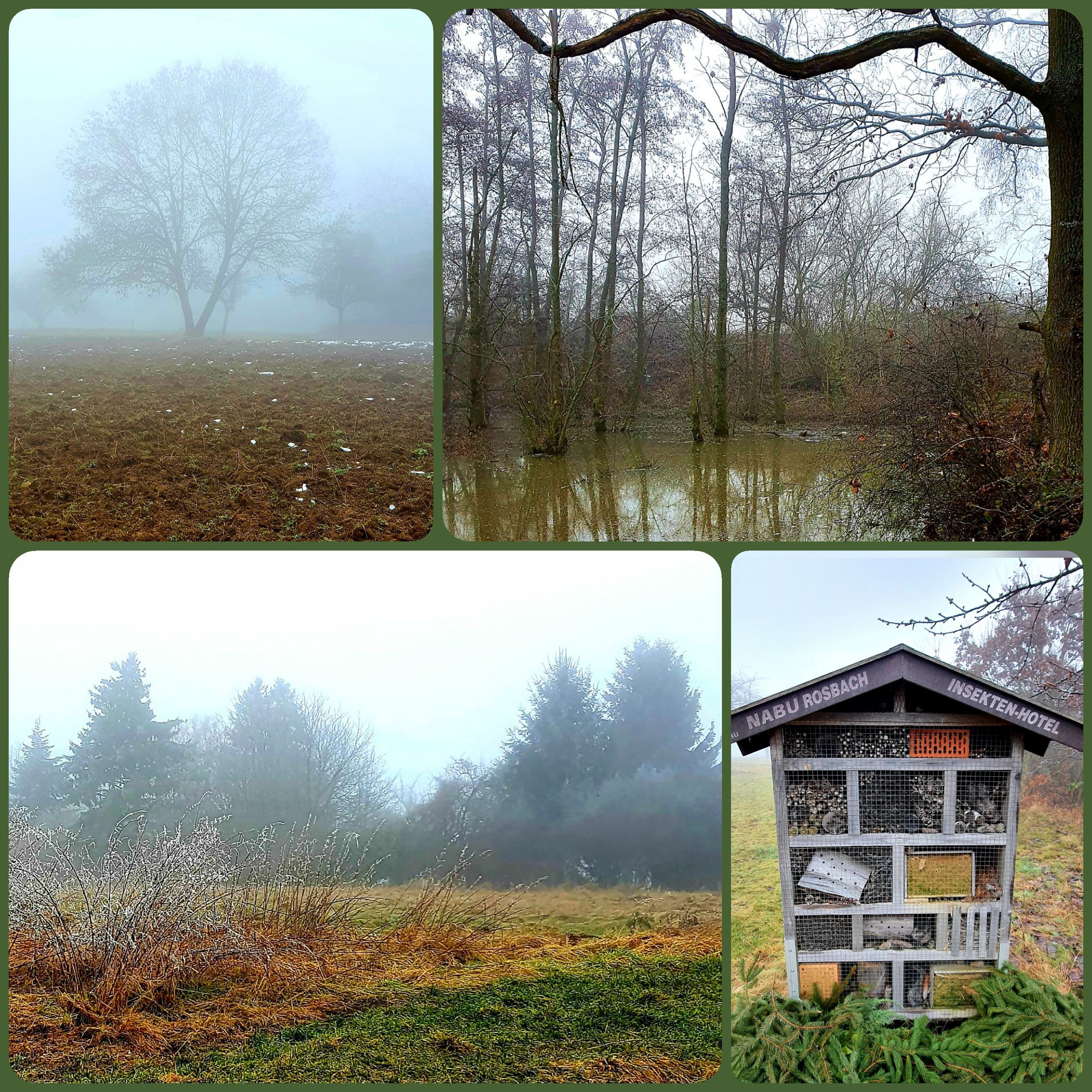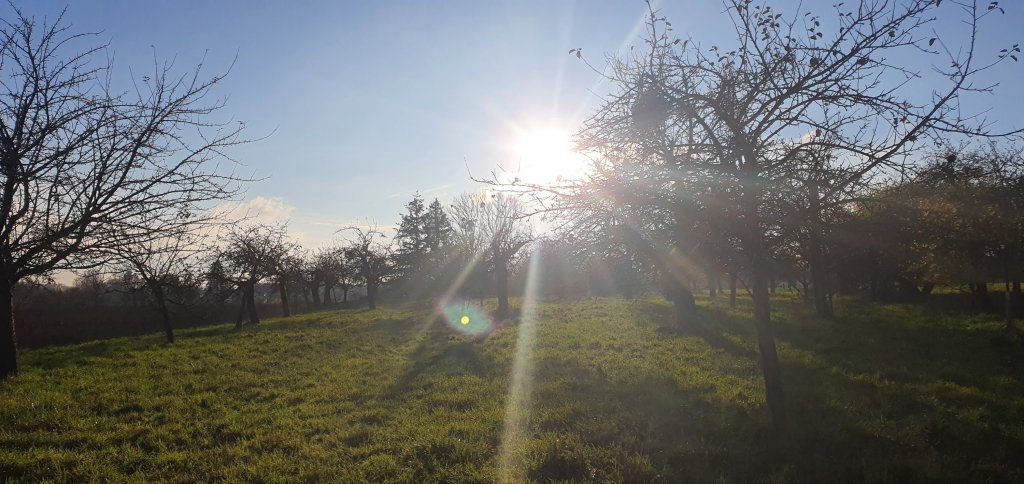 Taunus und Wetterau treffen sich hier.Streuobstwiesen – Misteln wachsen gerne auf Apfelbäumen und können diese sehr schwächen. Die vergangenen Orkane leisteten ganze Arbeit.Blick nach Rodheim mit dem alten Kirchturm und der neueren ev. Kirche