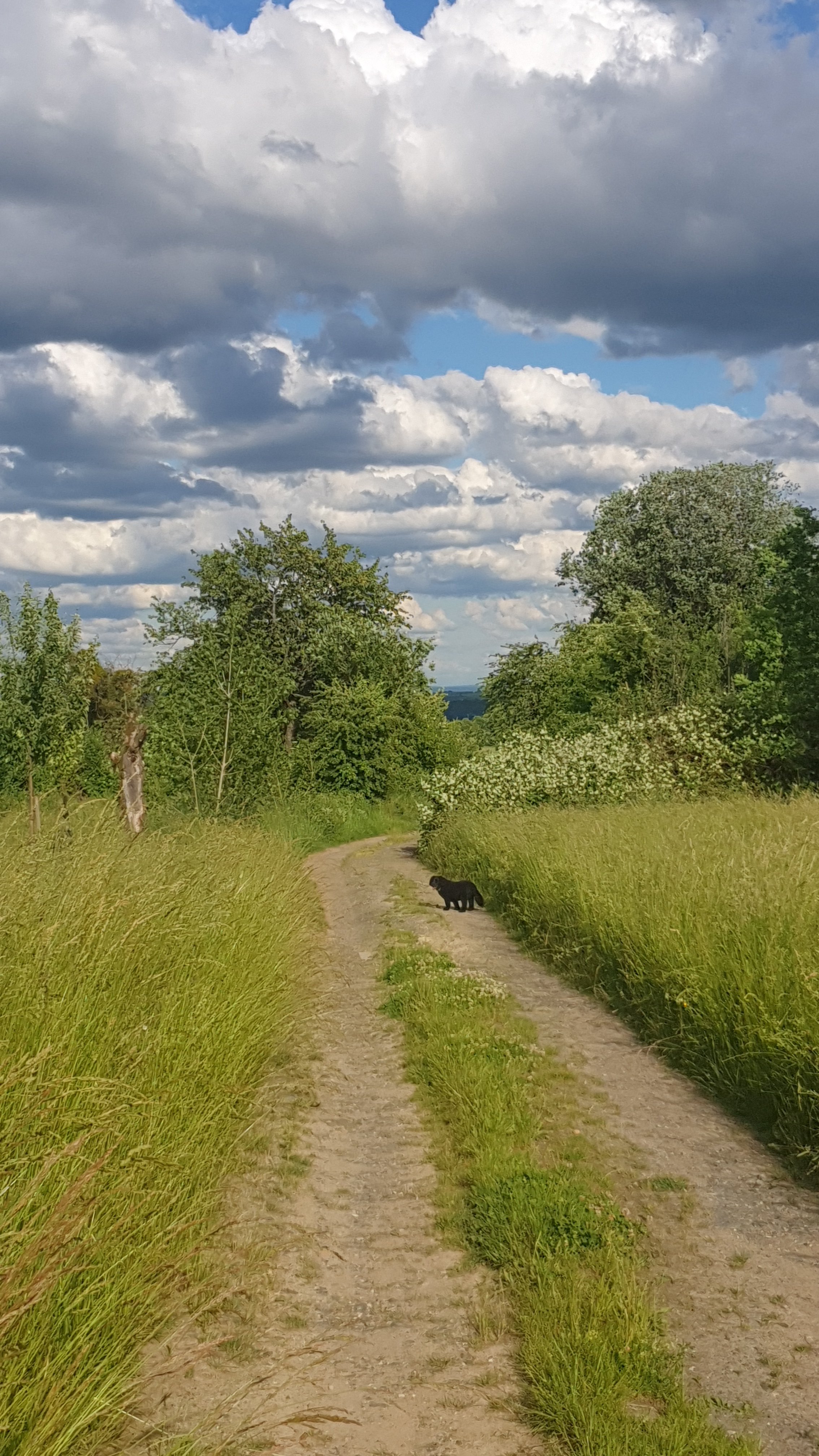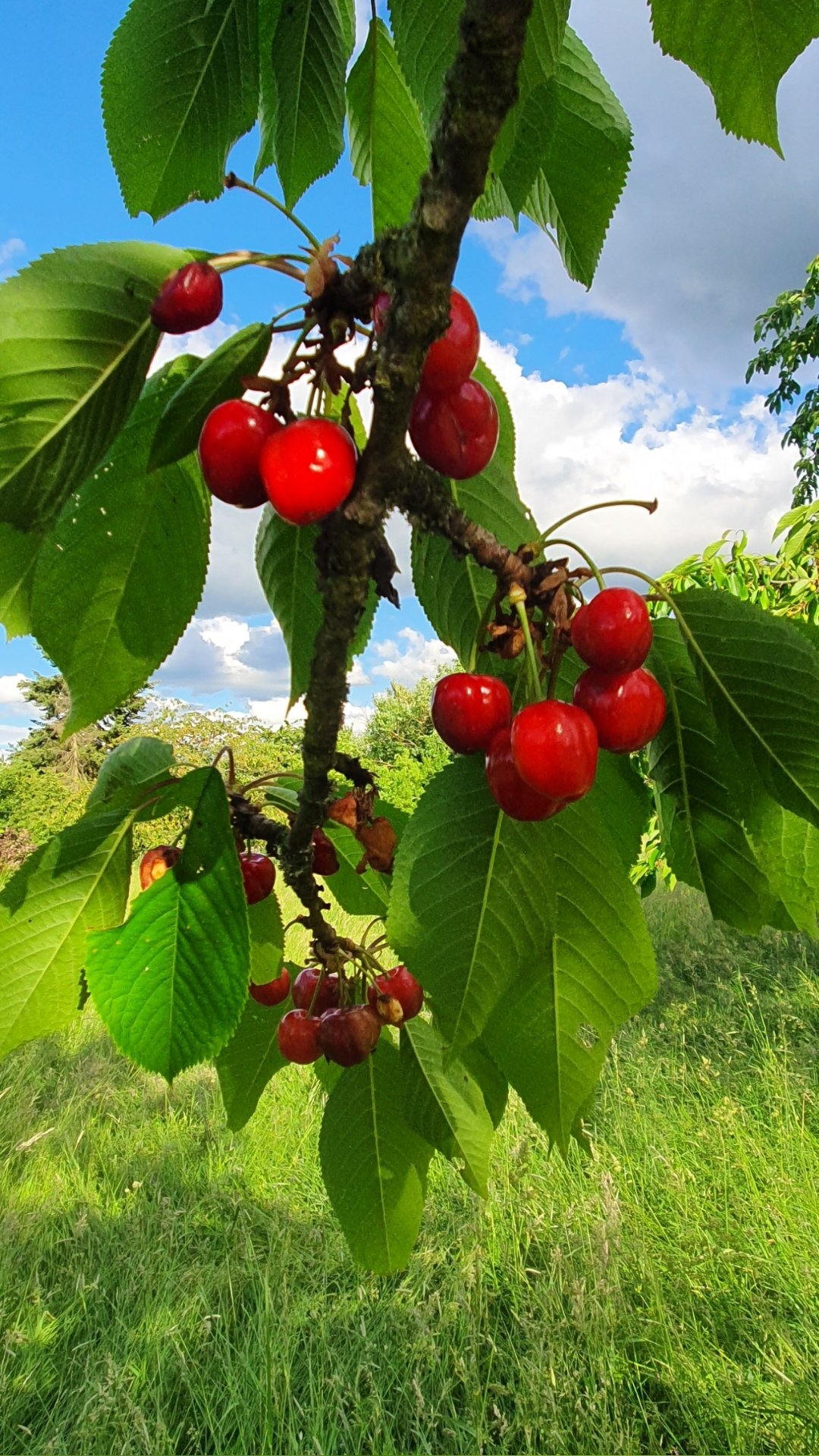 „Ich freue mich soo. Ich liebe es, auf weichem Boden zu laufen!“Streuobstwiesen WegeRusty wartet geduldig auf mich und schnuppert derweil.AbendhimmelEin Kirschbaum mitten im FeldEin paar Kirschen müssen getestet werden.Habt ihr schon mal einen Baum umarmt und dessen Kraft gespürt? Dieser Baum lud mich ein.Die Früchte sind schon gut ausgebildet.