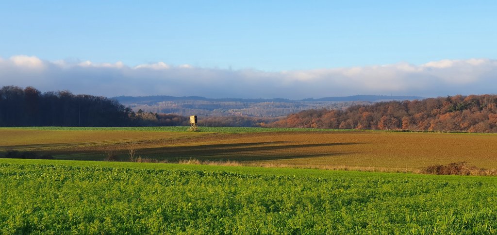 Er kann so schön guggen, aber fürs Foto schaut er weg.Das Feuchtbiotop wird hier „Bombenloch“ genannt. Mein Bruder brachte von hier Salamander, Froschlaich, Sichtungen und Molche für sein Außen-Terrarium mit. Das war in den 70ern.Blick in den TaunusEin riesiger Vogel, seine Spannweite beträgt geschätzte 1,50 m. Sieht aus wie ein Flugsaurier … wird wohl ein Reiher sein.Bahnlinie zwischen Nieder-Rosbach und RodheimUnsere Tour startete Ecke Kreuzweg am Rand von Rodheim in Richtung des Beinarzwaldes/Rosbach. Später liefen wir über Feld- und Wiesenwege Richtung Köppern/Taunus und machten einen Bogen entlang des Beinarzes zurück und stießen auf den geteerten Feldweg parallel zu den Bahnschienen. Der Spaziergang dauerte knappe zwei Stunden.